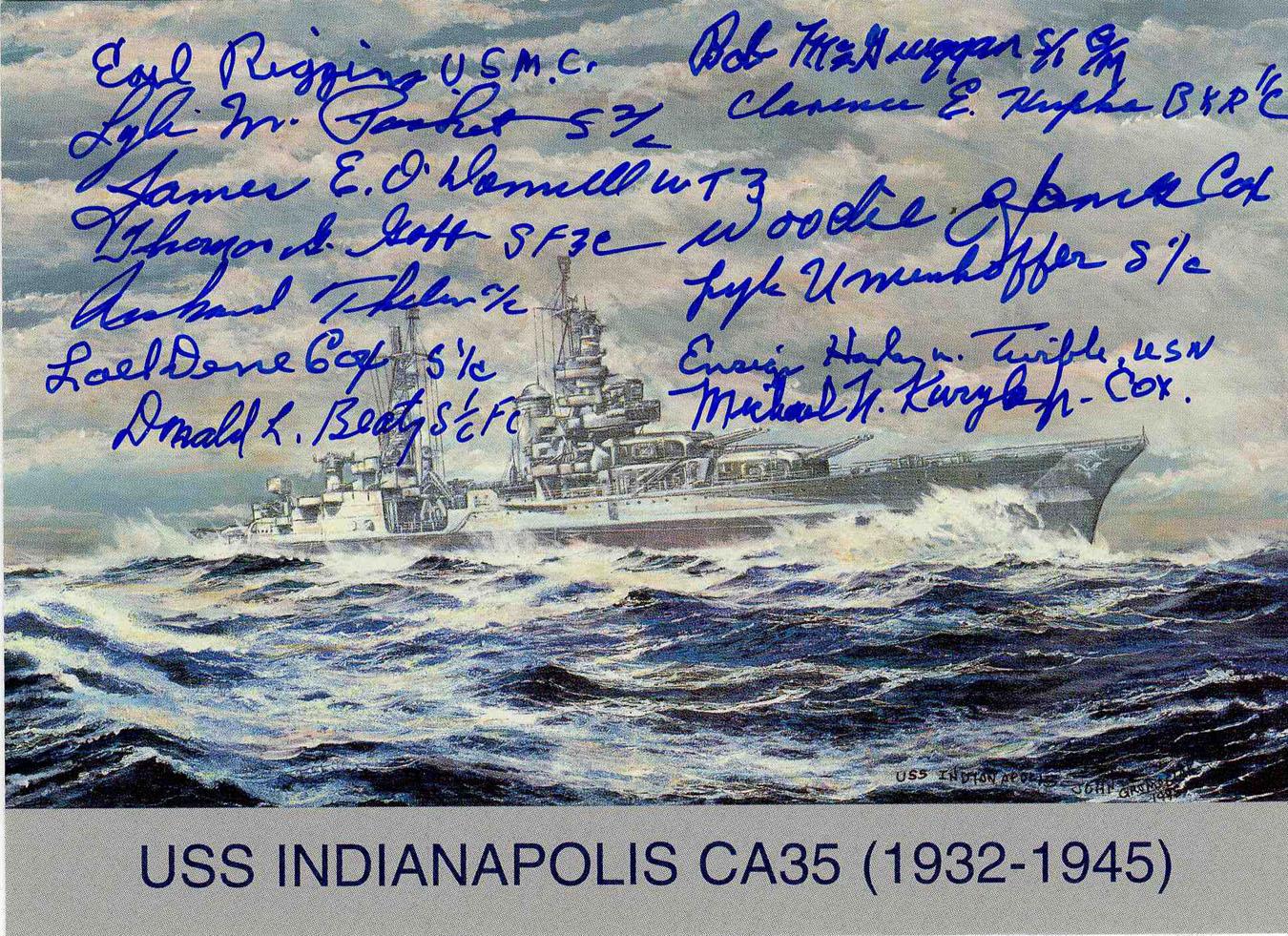 USS Indianapolis survivor autographed WWII postcard. 4'' x 6.5'' postcard signed by 13 survivors of the sinking USS Indianapolis CA35. Postcard features an image of the ship with the text, ''USS Indianapolis CA35 (1932-1945).'' Signatures include: Riggins (USMC), Pasket, O' Donnell, Goff, Loel Dene Cox, Thelen, Beaty, Kuryla, McGuiggan, Hupka, Woodie James, Umenhoffer, and Ensign Twible. Overall, excellent condition.