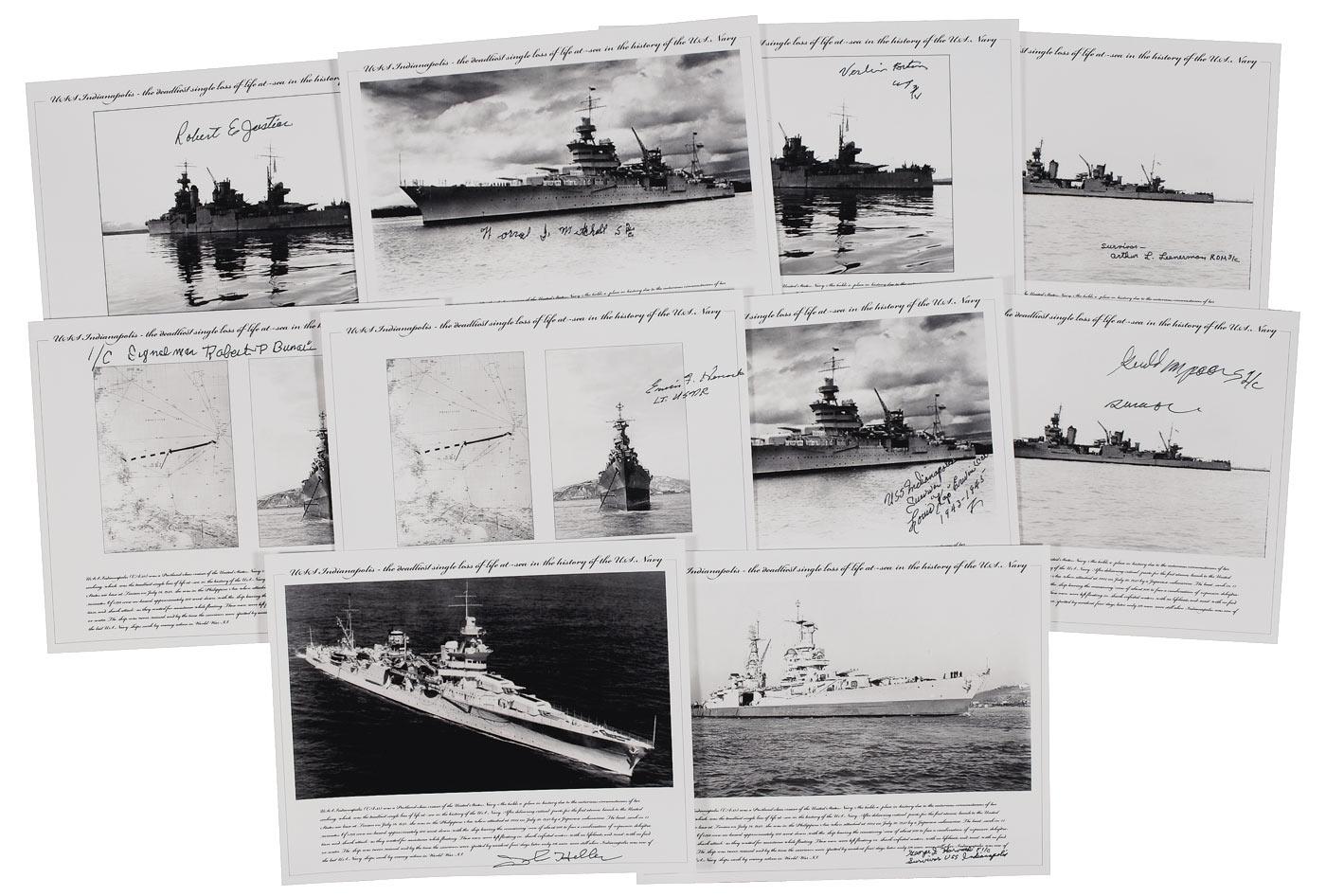 Ten satin-finish 10 x 8 photos, each signed in ink or felt tip by a survivor of the USS Indinapolis. Signers include: Robert Bunai, Louis Erwin, Verlin Fortin, George Horvath, Arthur Leenerman, and Robert Justice. In fine condition.