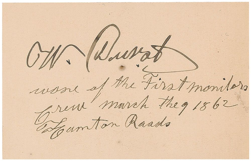 Ink signature, “W. Durst, Wone [sic] of the First Monitors crew, March the 9, 1862, Hampton Roads,” on an off-white 3.75 x 2.5 card. In fine condition, with a mild shade of overall toning.