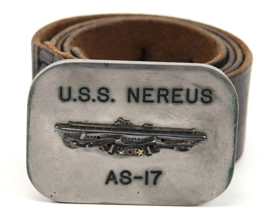 US Navy Ship belt and buckle. Buckle marked USS Nereus / AS-17. Approximately size 34. USS Nereus was a Fulton-class submarine tender, in service from 1945, until 1971.