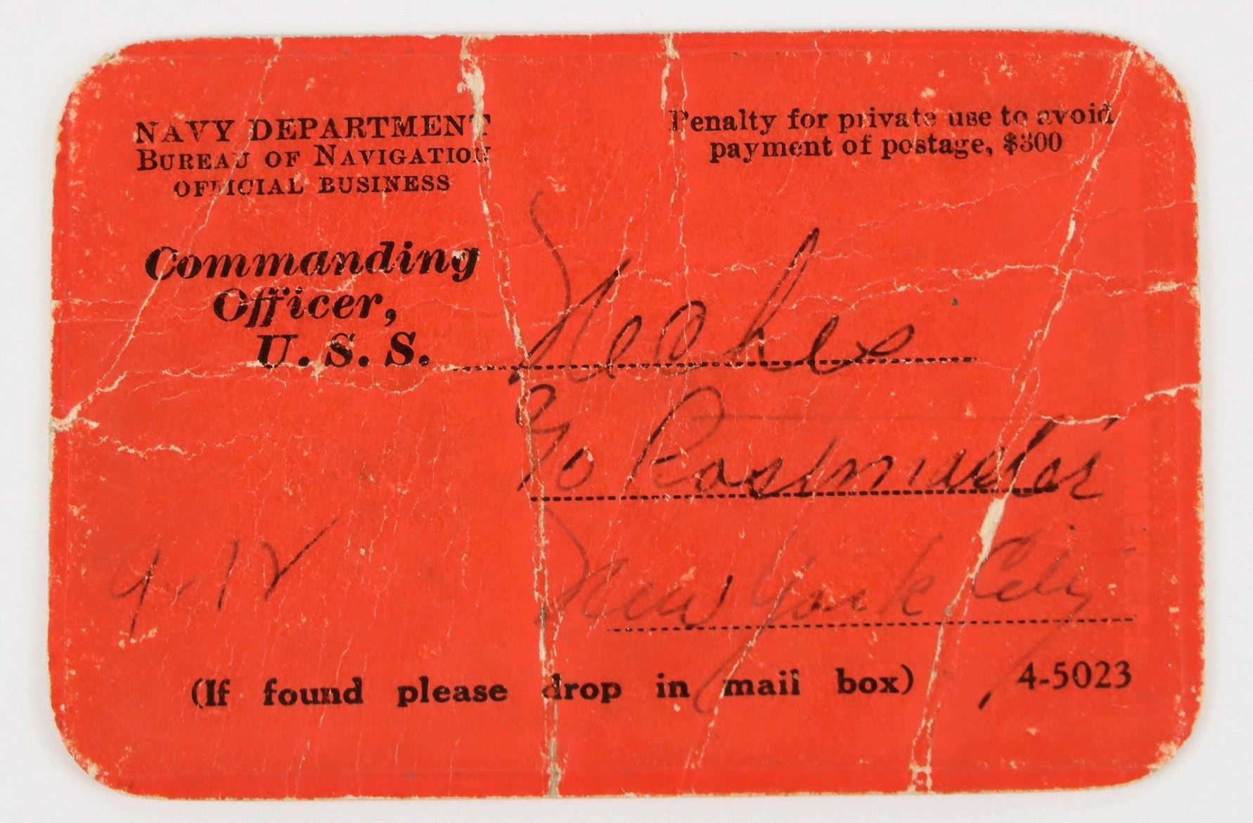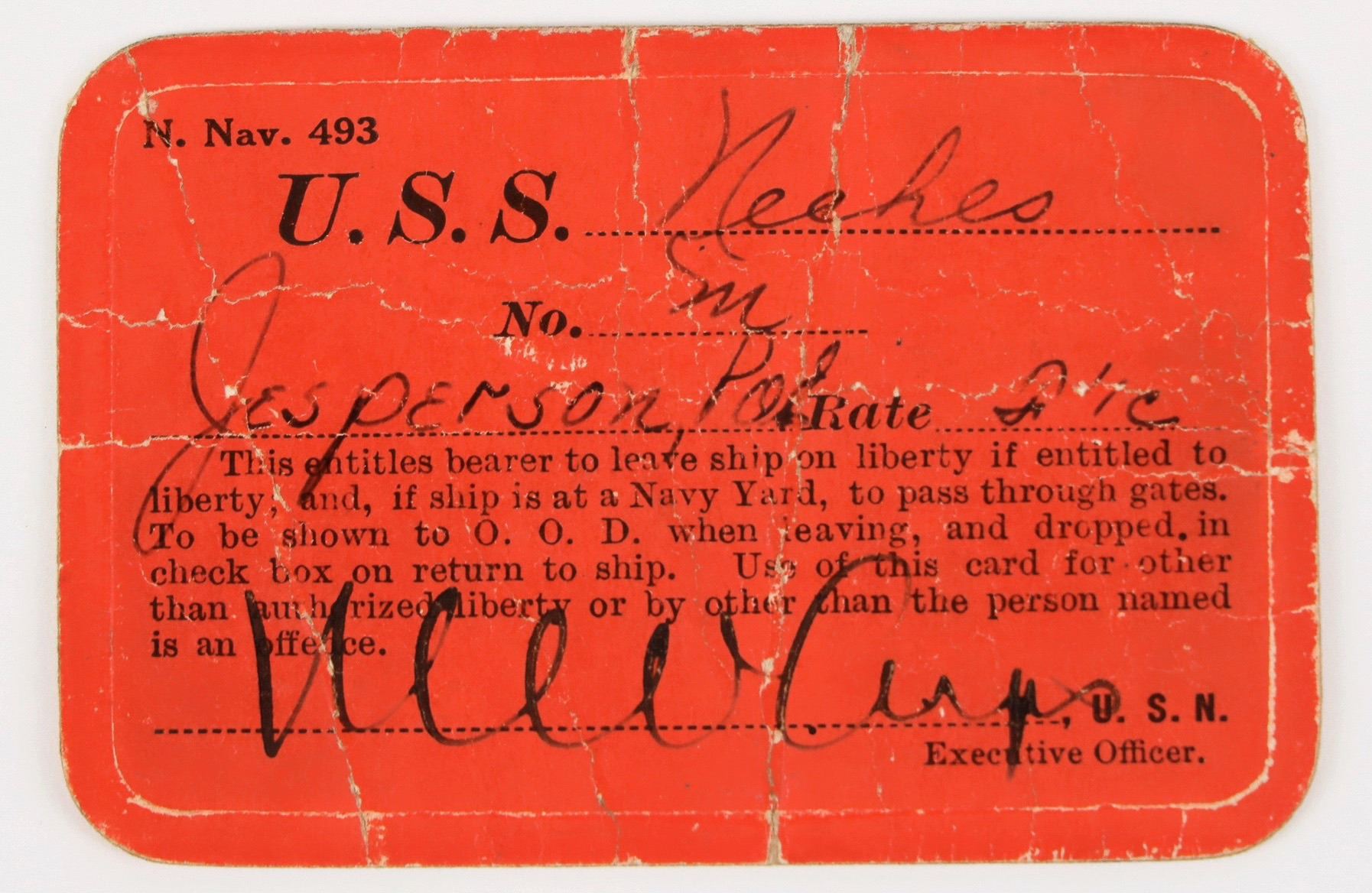 Cardboard pass for the USS Neches, entitled the bearer to leave ship on liberty and if ship is at naval yard to enter gates. 3 x 2" USS Neches was launched in 1920 as a refueling ship. It was torpedoed and sunk by I-72 on January 23rd, 1942 in World War II.