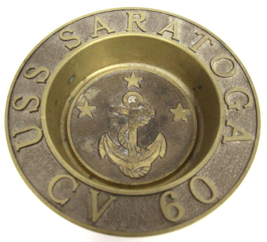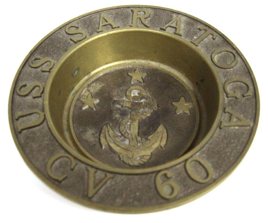 Brass ashtray with "USS SARATOGA CV 60" around rim, and Naval anchor in bottom. 5.5 inch diameter, in good condition.