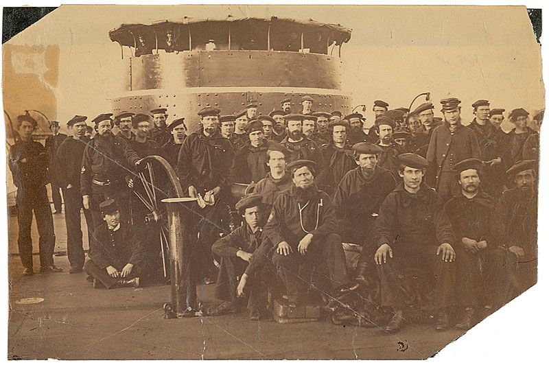Vintage albumen 7.25 x 4.75 photo of the seamen of the Union’s ironclad warship USS Sangamon. Most likely printed during the late 19th century. Heavy overall creases, block of toning to the left border from tape to reverse, clipped corners, and a repaired tear to the lower border, otherwise very good condition.