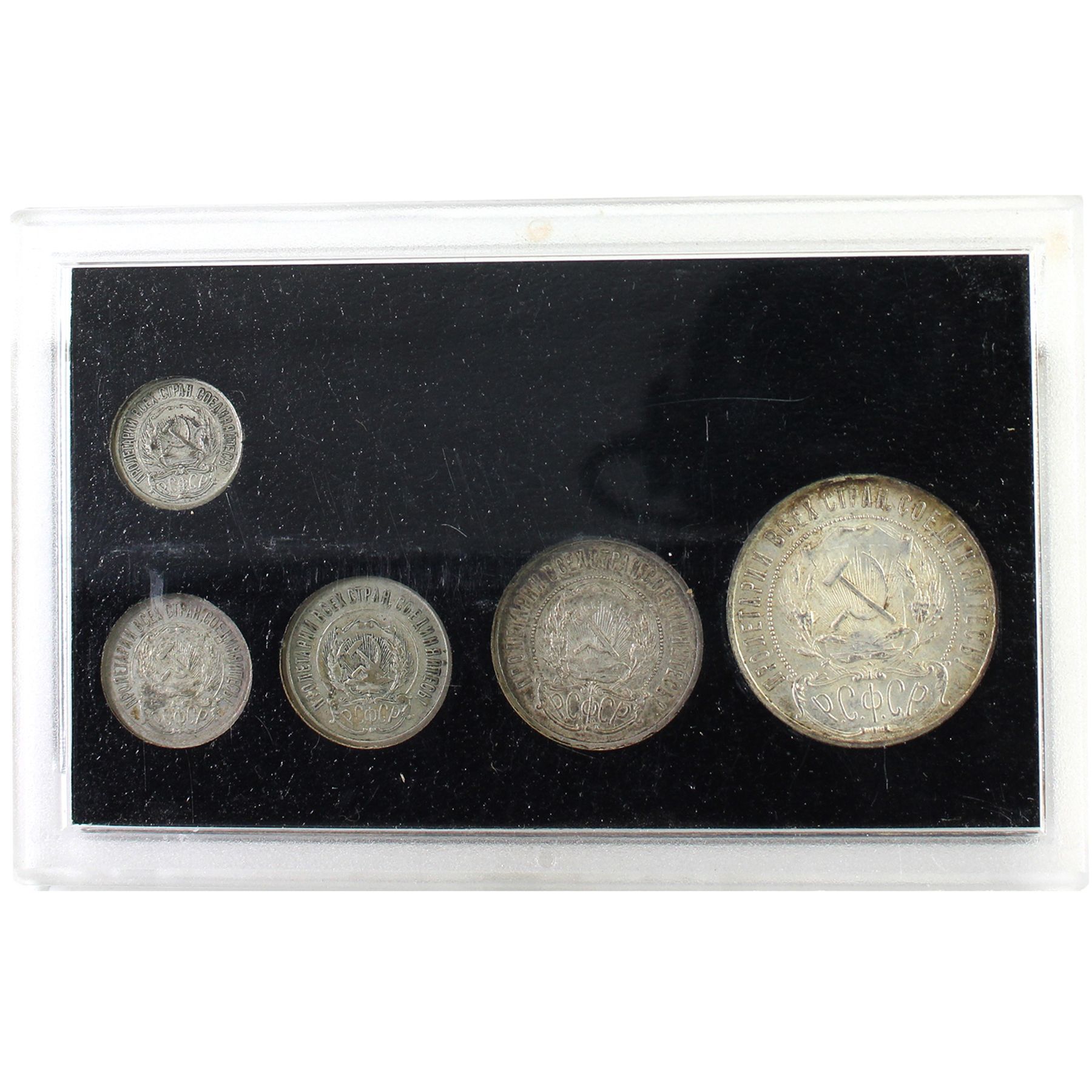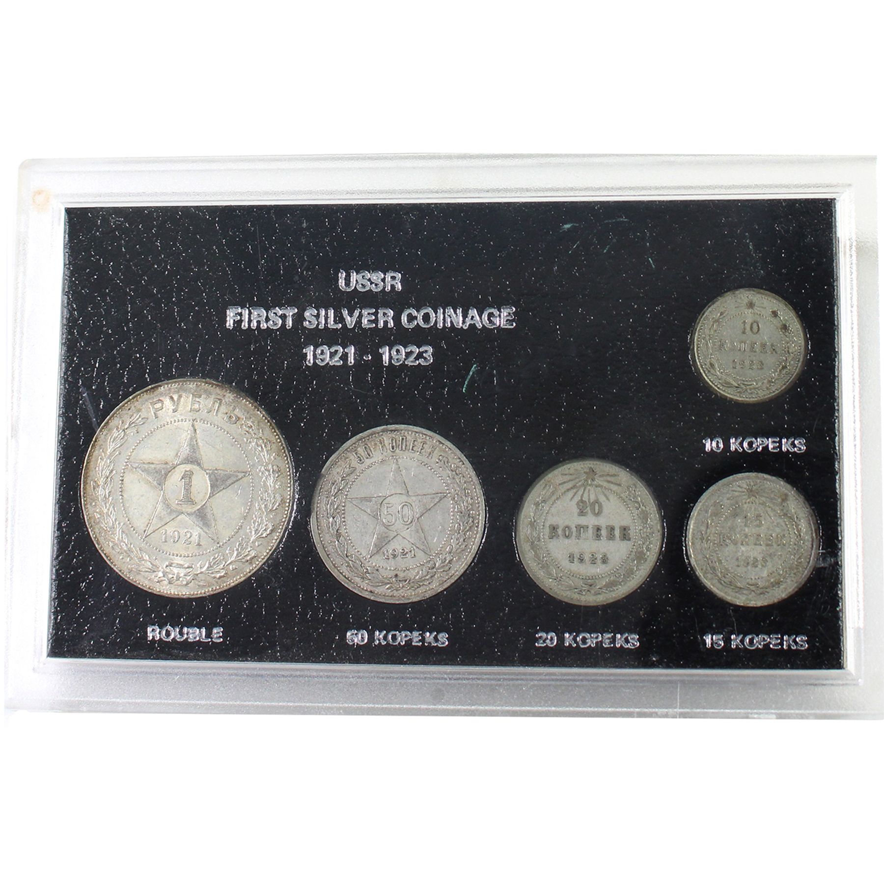 INCLUDES: 1 Rouble and 50, 20, 15 & 10 Kopeks. Some scuffs on holder