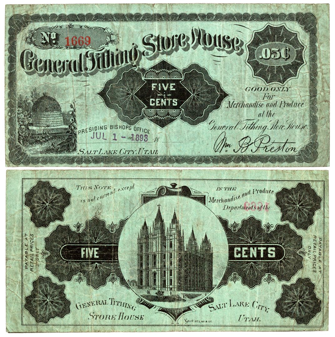 Nyholm 308 Rust 222 A 5c note issued on green paper and states that it is ‘Good for Merchandise and Produce’ at the General Tithing Store House. These green examples are slightly scarcer than the brown or ‘meat’ scrip. Another FINE example dated Jul. 1, 1893. HKA#63444