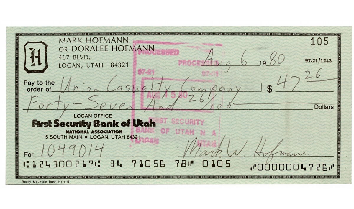 An interesting piece of history offered here. A personal check written by the infamous murderer and forger of Mormon and Utah documents. HKA#63441