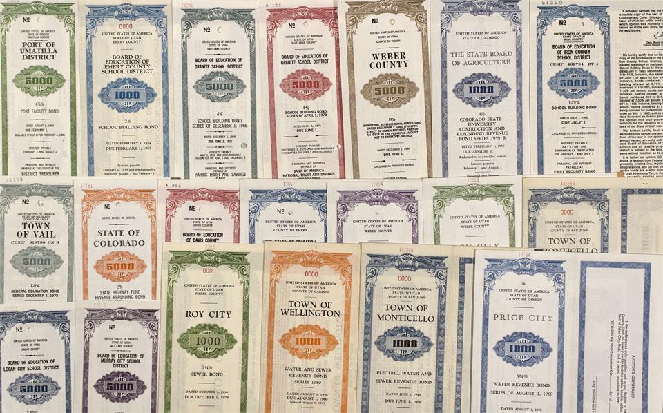 Lot of 19 different bonds. Twelve building, sewer, water and electric bonds from Utah. Three refunding, and general obligation bonds from Colorado, and 4 miscellaneous bonds from New York, Illinois, Oregon, and California. All unused and U/C, various colors with vouchers attached. Overall lot is in very good condition.
