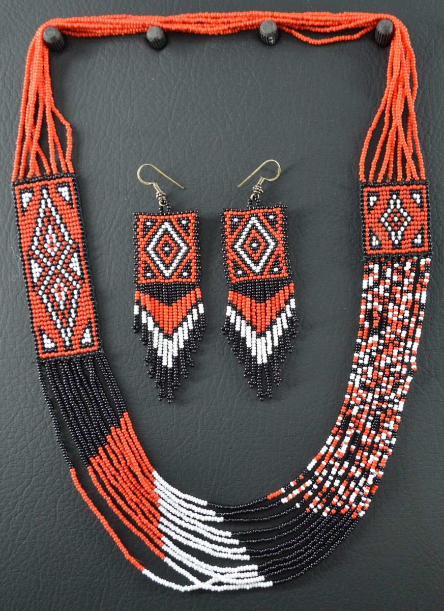 1970-80's. Beaded rug design, 24" long. Matching dangle earrings, 1.25" x 3.5"