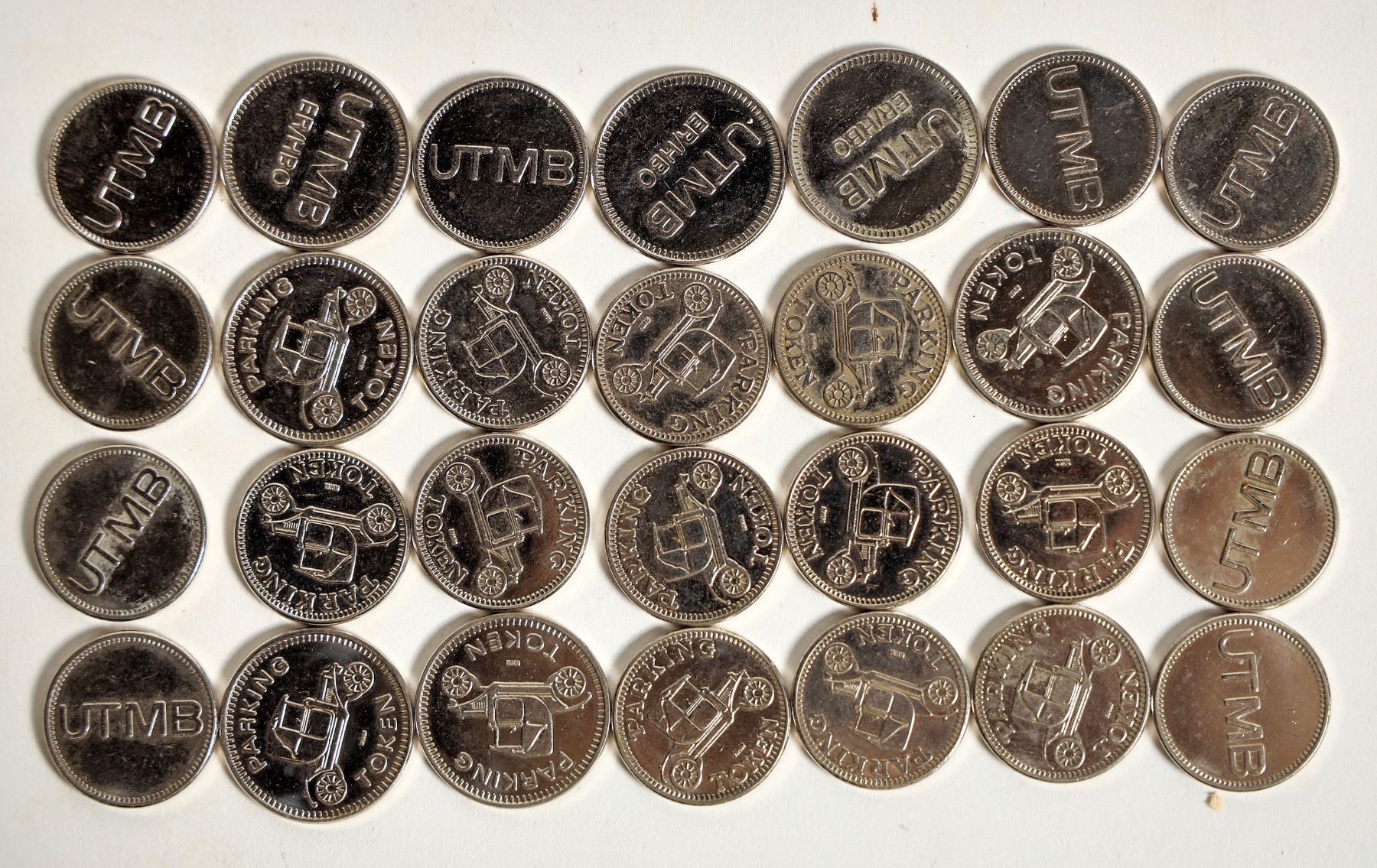 Parking Token for University of Texas Medical Branch in Galveston, TX. A few of the coins are darkened or specked with rust, though the majority are in good condition with minimal scratching or discoloration; see photo._x000D_