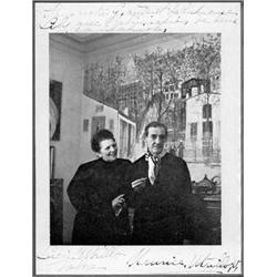 (1883 - 1955) French painter, illegitimate son of Suzanne Valadon known for his street scenes in Montmartre. Scarce S.P. 5" X 6 1/2" b/w, a portrait on printed stock showing the painter with his wife LUCIE in their home, inscribed in the hand of Lucie at top margin, and signed by both beneath. Ink is just a bit light, otherwise very good, matted in light blue and ready to frame.