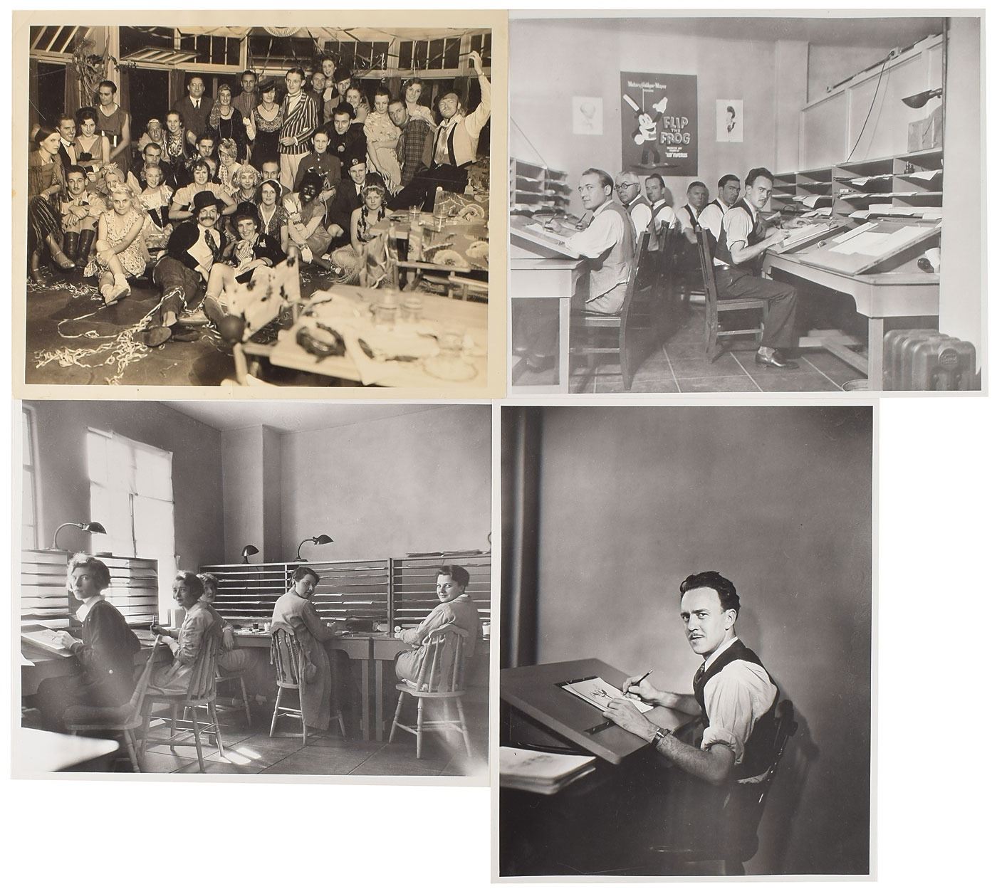 Group lot of photos commemorating the Ub Iwerks Studio and its various animators between the years 1930 and 1936, including: a vintage glossy 10 x 8 photo of numerous Iwerks employees during a Halloween party, with future Looney Tunes cartoonist Chuck Jones seen in the front wearing a fake mustache; a modern satin-finish 8 x 10 photo of Iwerks at his desk drawing Flip the Frog; a modern satin-finish 10 x 8 photo of Iwerks working alongside several other animators, with a Flip the Frog poster seen hanging on the wall; and a group of five 'ink and paint' girls from the Iwerks studio. In overall fine condition, with some slight creasing to vintage photo. Consignor notes that the photos were obtained from Gladys MacArthur, one of the 'ink and paint' girls from the Iwerks Studio.