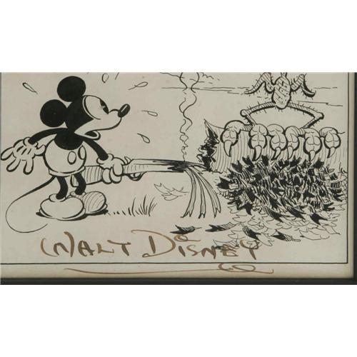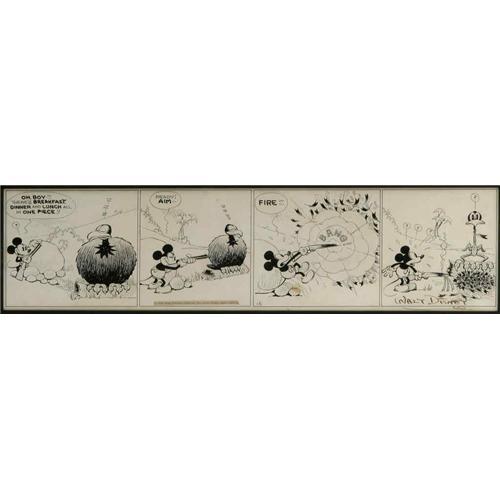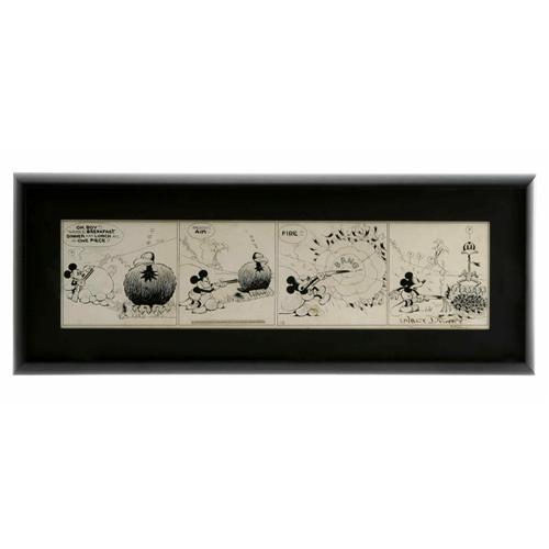 <B>Ub Iwerks and Win Smith - Mickey Mouse Daily #15 Comic Strip Original Art (King Features, 1930).</B></I> Here is the most famous mouse in the world as he appeared in Hearst newspapers on January 29, 1930, before he was so famous. The question of who actually created Mickey has stirred lively discussion over the years. These facts we know: Walt Disney's studio had been producing cartoons featuring Oswald the Lucky Rabbit when Disney suddenly lost the rights to the character. Most of Disney's staff was hired away by competing animation studio Charles Mintz to continue the Oswald cartoons, leaving Walt with only a few loyal artists, including his early partner Ub Iwerks. Ub (born Ubbe Ert Iwwerks, from Dutch immigrant parents) was assigned to a new, secret animation project -- starring a mouse named Mortimer. This new character was soon renamed Mickey after eight-year-old child star Mickey McGuire (Rooney) stopped by the studios to visit, and Walt liked the name. Mickey's first animated cartoon, "Plane Crazy," was entirely drawn by Iwerks in 1928, and was quickly followed by a second film when "talkies" made their big splash in the entertainment world. The third film was designed to capitalize on this new trend, and the earlier two silent cartoons were shelved (and later released with added sound effects). As a result, this new cartoon, "Steamboat Willie," was a huge hit. Merchandising deals soon followed, including an offer from King Features to run the adventures of Mickey as a daily comic strip in Hearst-owned papers. Iwerks was picked to pencil the strip, Win Smith provided the inks, and Walt himself scripted the first sequence. This fifteenth strip is from the third week of the original "Lost on a Desert Island" storyline, and was titled "Too Many Feathers Spoil Big Meal." Iwerks continued to pencil the strip for three more days before leaving Disney Studios to form his own animation company. In 1940, Iwerks returned to Disney, as head of the Technical Department; he remained close to Walt for the remainder of his life. Iwerks is credited with over 200 movies, including Alfred Hitchcock's classic film "The Birds." He received two Academy Awards for his brilliant film inventions, and has been widely regarded as the "Albert Einstein" of the animation film industry. This original art has been professionally matted and framed to an overall size of 29" x 11"; the image area is approximately 23" x 6" and is in Excellent condition, save for a few tiny stains. The Walt Disney signature in the last panel was added after publication; after careful consideration, we now believe this to be by one of Walt's original staff of artists, rather than from Mr. Disney himself (as was the standard practice at the Disney studio for many years). Since this historic early Mickey Mouse is one of but a very small number of originals from this era still known to exist, the opportunity to own such an item comes rarely indeed.
