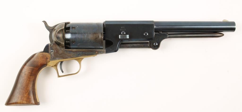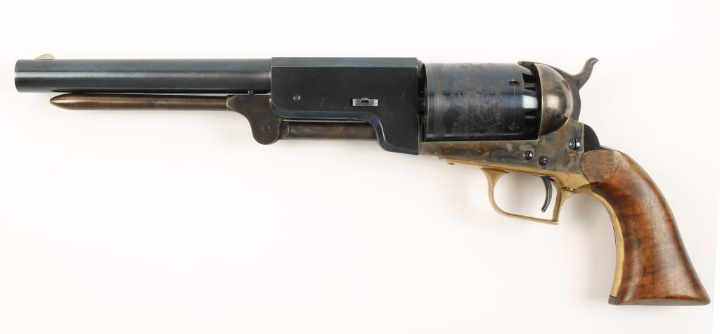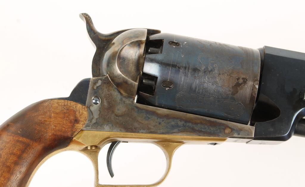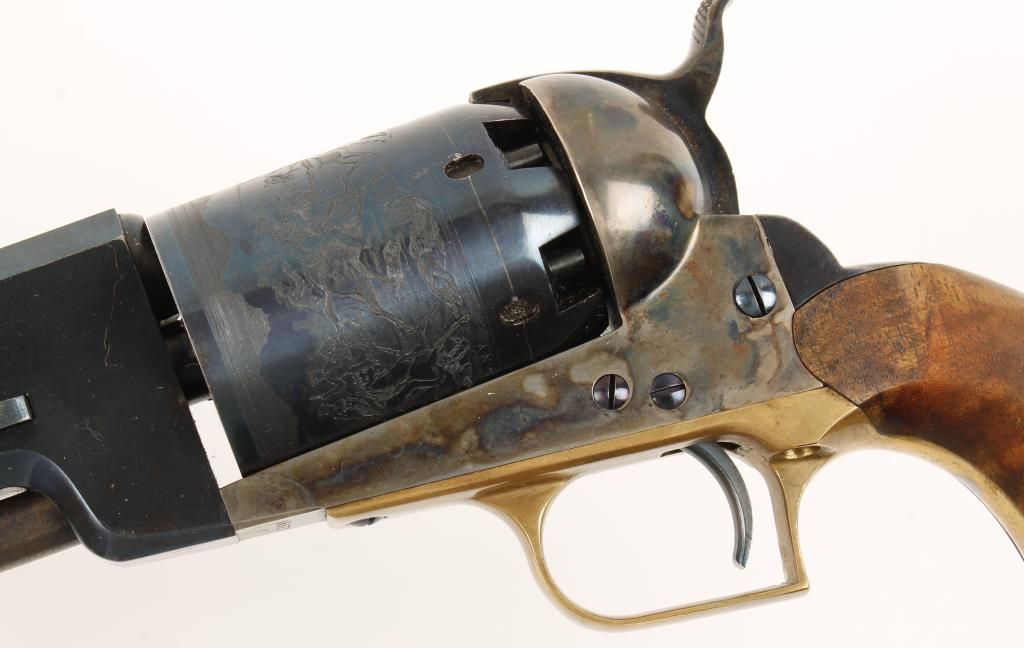 Replica black powder single action 6-shot pistol. 9" barrel. Color cased loading lever. Engraved cylinder showing an indian battle scene. Case colored frame and hammer. Square backed brass trigger guard. Steel backstrap. Not milled for shoulder stock. Condition is very good with light drag line. *Antique Firearm*