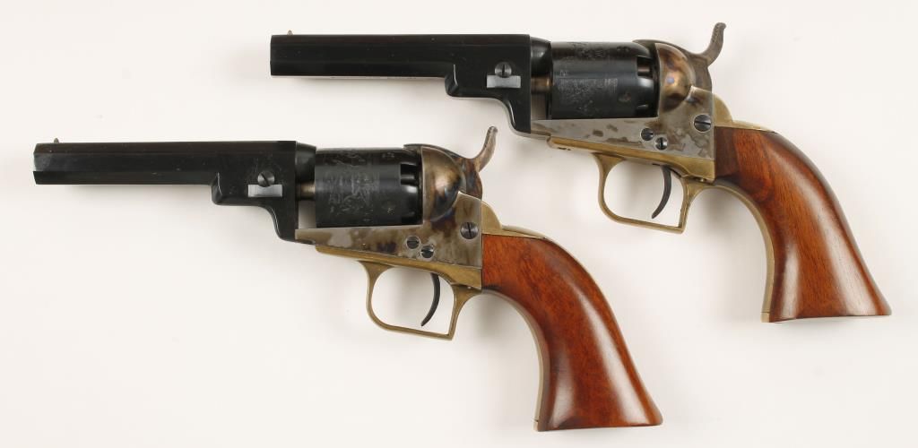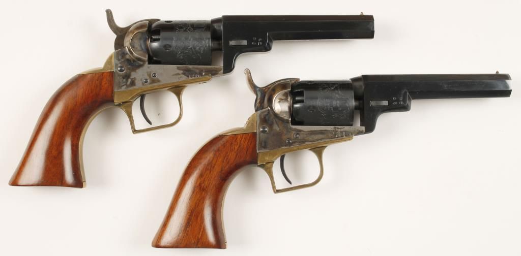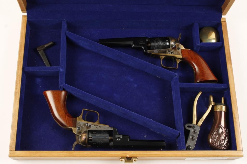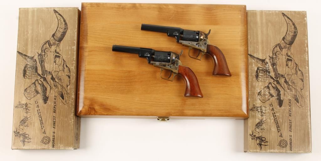Cased set of two consecutively numbered replica black powder single action 6-shot pistols. Blued 4" octagon barrels. Long frames. No loading levers. Blued and roll-stamped cylinders showing stagecoach hold-up. Case colored frames and hammers. Blued triggers. Brass trigger guards and back straps. Not cut for shoulder stocks. Hardwood case is velvet lined and contains tools for loading. Original Uberti boxes with documents are included. Condition is like new in box. *Antique Firearm*