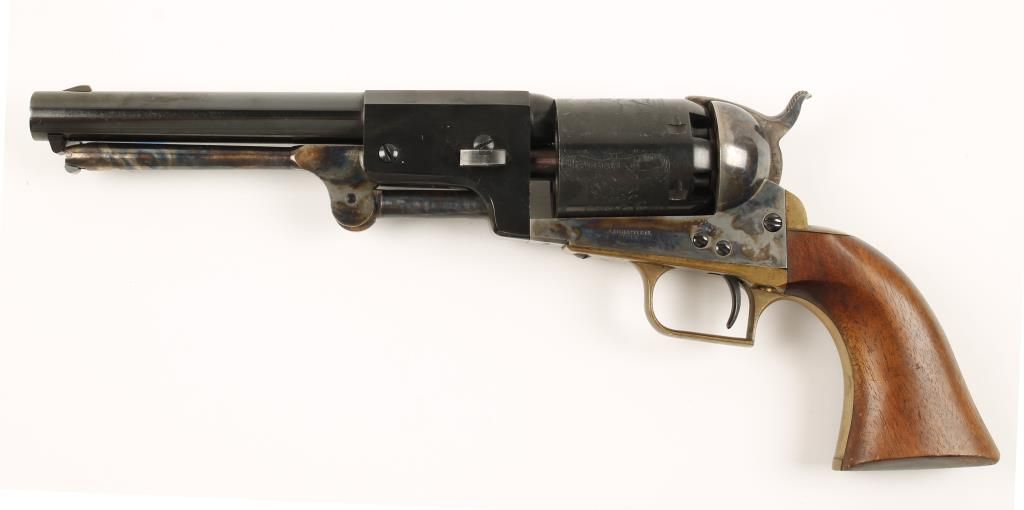 Replica black powder single action 6-shot pistol. 7-1/2" blued barrel. Case colored loading lever, frame, hammer and trigger. Blued and engraved cylinder showing an indian battle. Brass square backed trigger guard and backstrap. Not cut for a shoulder stock. Condition is . *Antique Firearm*