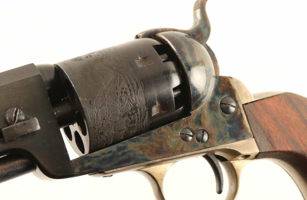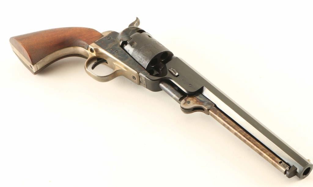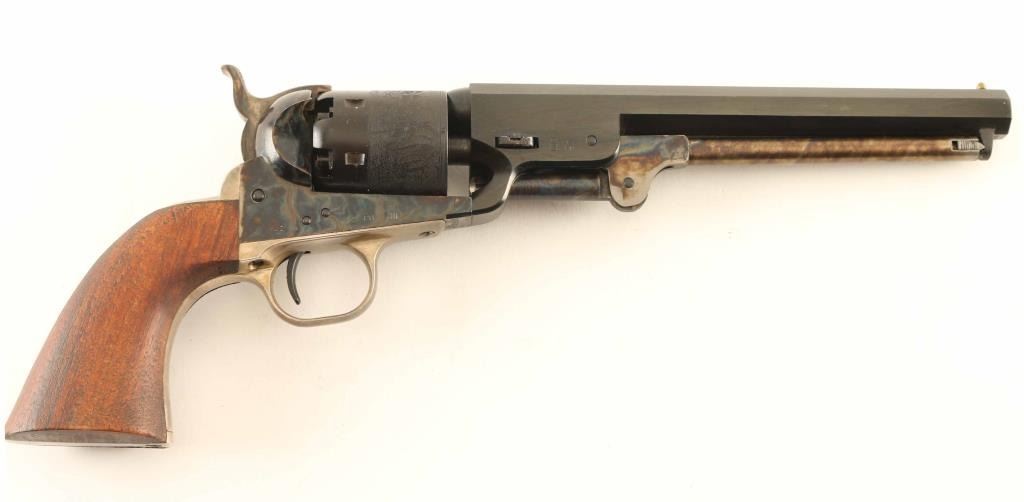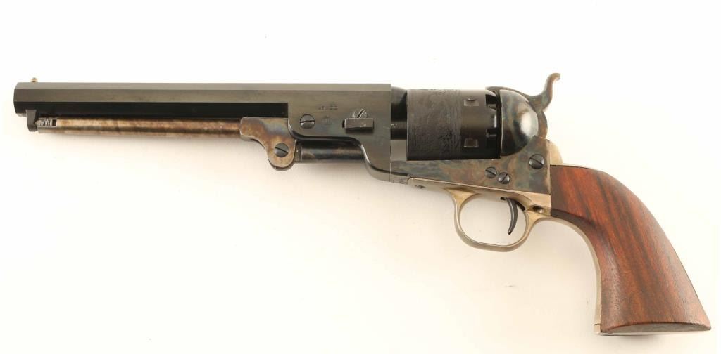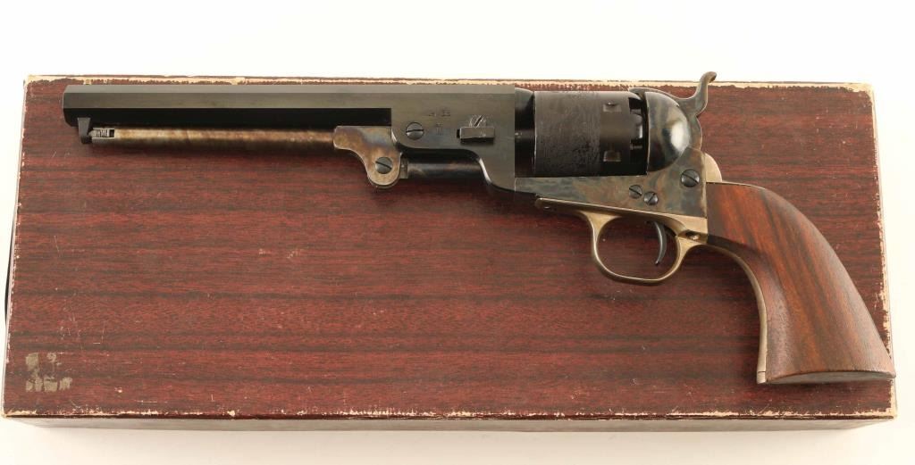 Italian made reproduction of the Colt 1851 Navy civilian model chambered for .36 caliber ammunition, manufactured circa 1967. Imported by Navy Arms Co. of Ridgefield, N.J. with import stamp on the top of the barrel. Features a blued & case hardened finish, 7 1/2" octagonal barrel, brass cone front sight, square notch rear sight cut into the hammer lip, smooth thin trigger, serrated hammer spur, loading lever, non-fluted six-shot cylinder with roll stamped naval engagement scene, silver plated grip frame and one-piece smooth wood grip. Includes the original two-piece wood grain cardboard box with documents. Revolver retains approximately 95% of it's blued & case hardened finish showing finish loss on the left side of the barrel and a spot of surface rust on the left recoil shield. The silver plating on the grip straps has worn to a faint layer. Action is smooth, the bore is bright and the wood grip is near fine. Condition is near NRA Very Good in box. ***Antique Firearm***