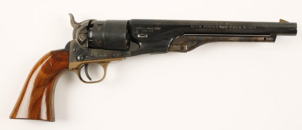 Replica black powder single action 6-shot pistol. 8" blued barrel. Case colored loading lever, frame, hammer and trigger. Engraved and blued cylinder showing a naval engagement. Brass trigger guard. Blued backstrap cut for a shoulder stock. Condition is good. *Antique Firearm*
