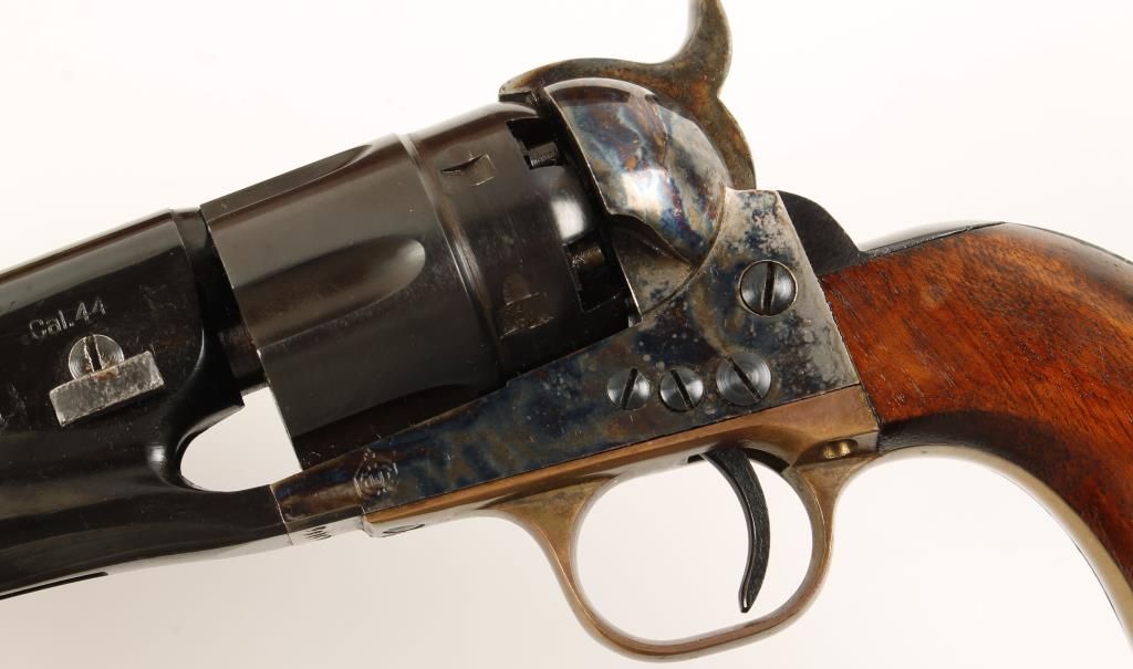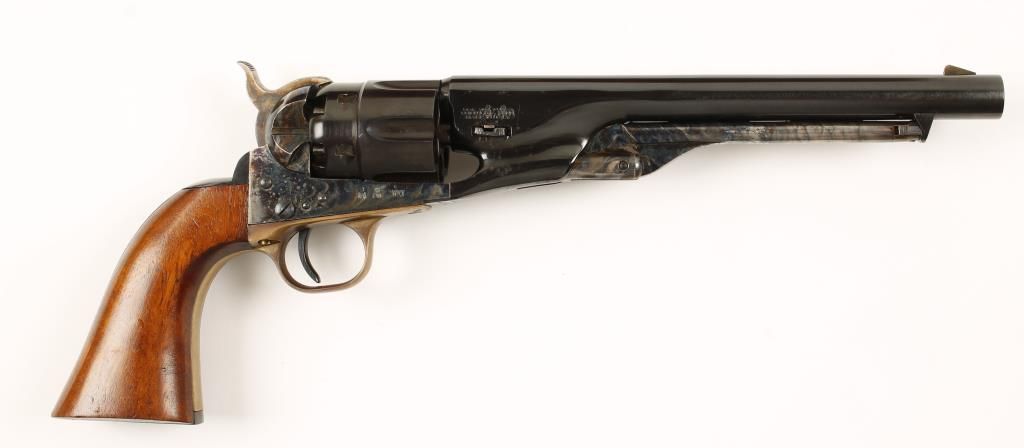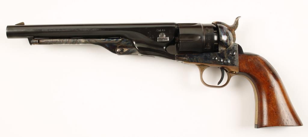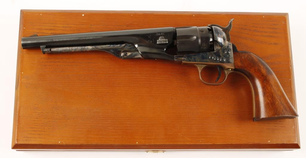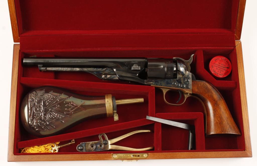 Cased replica black powder single action 6-shot percussion pistol. Blued 8" barrel. Case colored loading lever, Frame and hammer. Blued half-fluted cylinder. Brass trigger guard. Blued backstrap cut for a shoulder stock. Lined hardwood case with loading and maintenance tools and a key. Condition is good. *Antique Firearm*