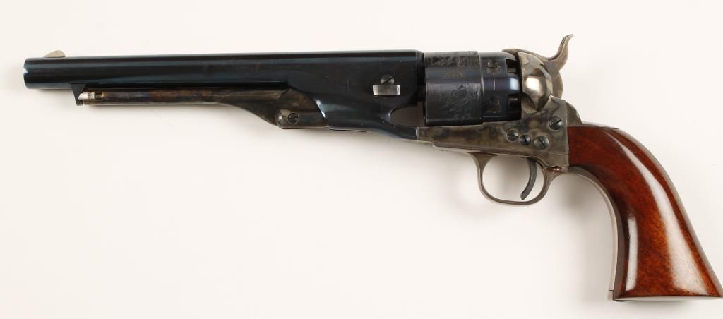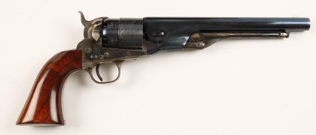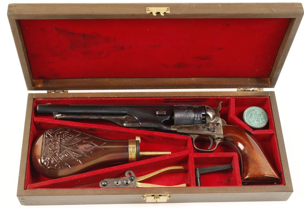 Cased replica black powder single action 6-shot percussion pistol. Blued 8" barrel. Case colored loading lever, frame and hammer. Blued and roll-stamped cylinder showing a naval engagement. frame. Plated non-ferrous trigger guard and backstrap. Cut for a shoulder stock. Lined hardwood case with loading and maintenance tools. Condition is very good. *Antique Firearm*