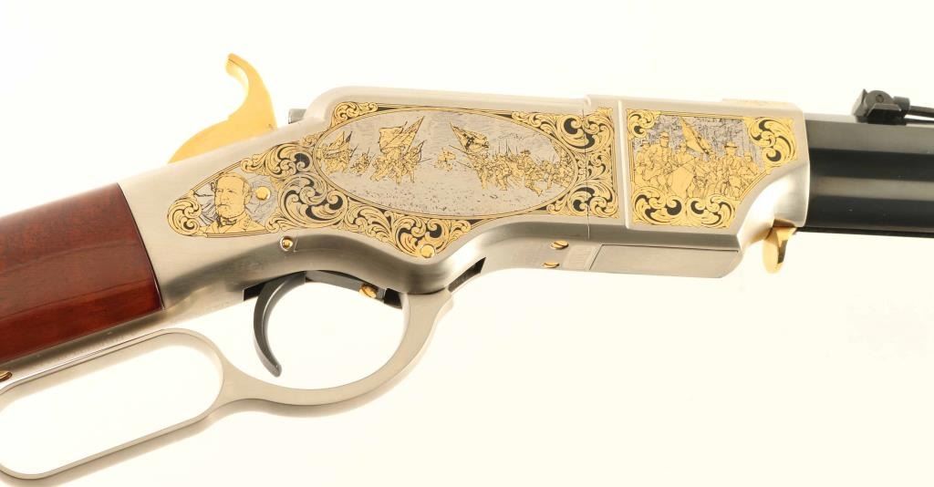 'Mort Künstler Civil War Sesquicentennial Tribute' commemorative rifle made in Italy. Features 24" octagonal barrel, full length magazine tube, blade front sight, flip-up ladder elevator type rear sight, blued barrel & mag tube, nickel & gold colored action, nickel finished finger lever & buttplate. Butt is fancy figured walnut with urethane type finish, crescent buttplate, engraved and color inlaid on both sides with signature "M Künstler". Engraved receiver displays scenes of battle from the US Civil War, likeness of Künstler & Abraham Lincoln. Overall condition is like new, with signs of handling. Condition is NRA Excellent - like new *** Modern Firearm ***