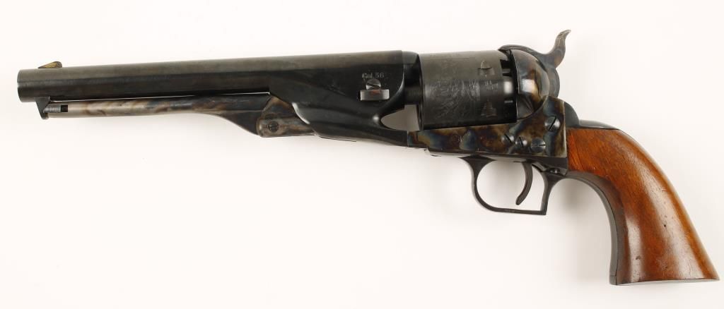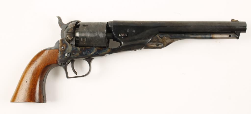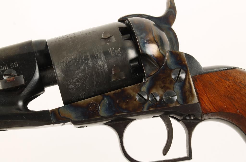 Replica black powder single action 6-shot pistol. 7-1/2" blued barrel. Case colored loading lever, frame, hammer and trigger. Blued and roll-stamped cylinder showing a naval engagement. Blued trigger guard and backstrap. Cut for a shoulder stock. Condition is very good. *Antique Firearm*