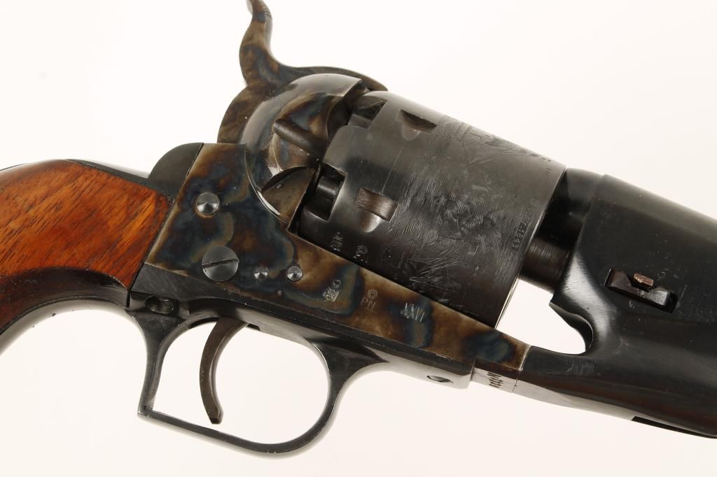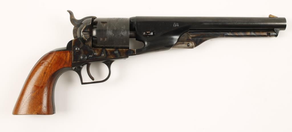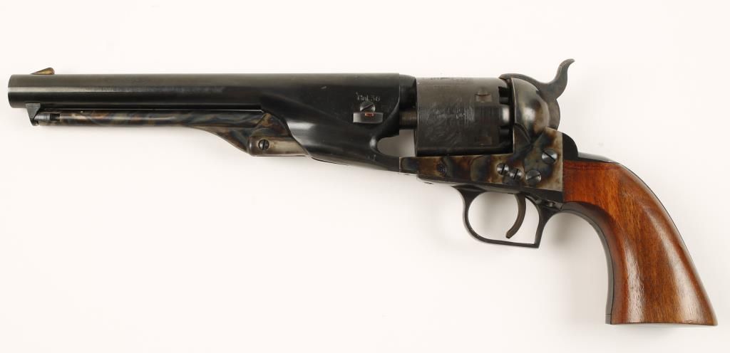 Replica black powder single action 6-shot pistol. 7-1/2" blued barrel. Case colored loading lever, frame, hammer and trigger. Blued and engraved cylinder showing a naval engagement. Blued square backed trigger guard. Blued backstrap cut for a shoulder stock. Condition is very good. *Antique Firearm*