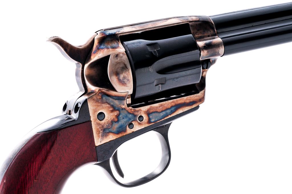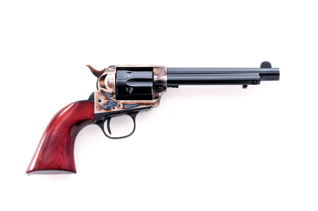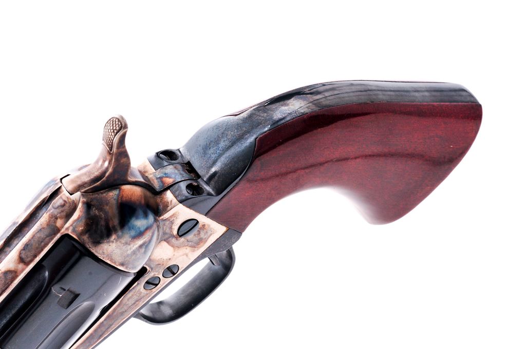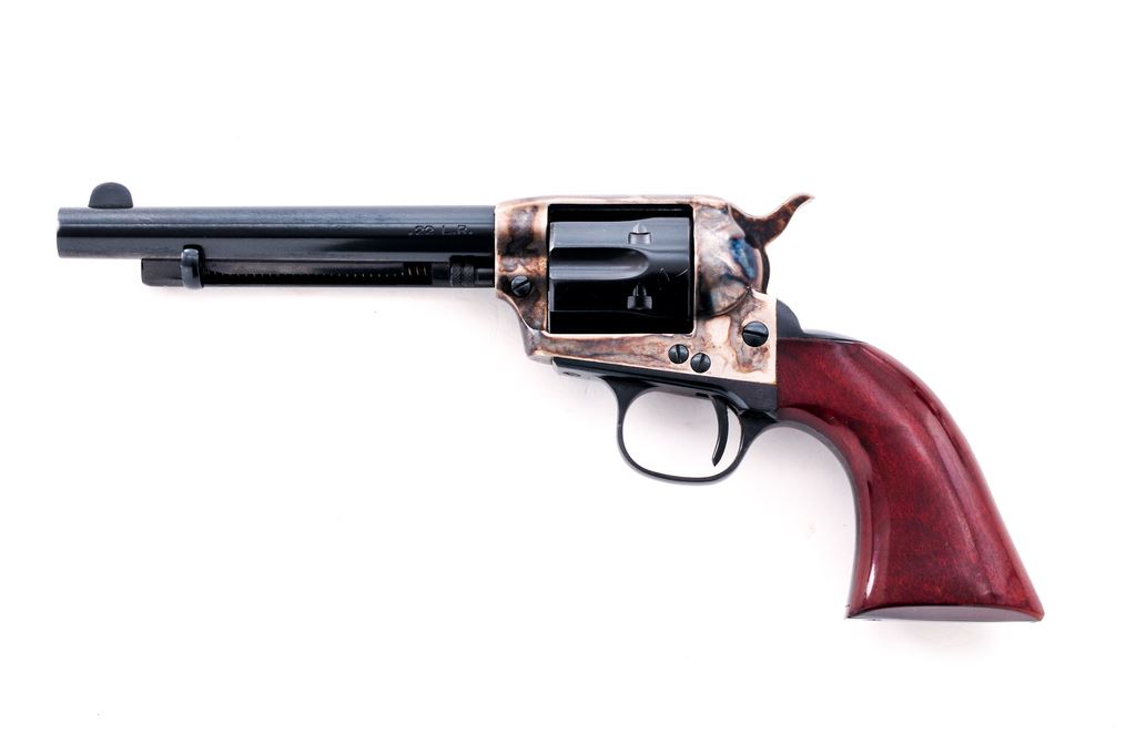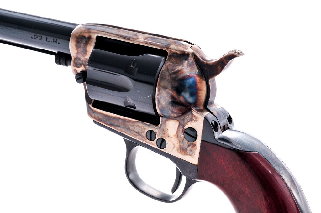 Uberti 1873 Cattleman Single Action Revolver, #J46164, .22 LR cal., 5.5'' barrel, blue and case hardened finish, smooth wood grips, with standard fixed sights. Approx. 98% blue and case colors remain and this revolver rates as excellent. Cylinder with light scratching but appears to have been turned very little. Grips show light impressions and handling marks, mainly to the right grip; nearly all of the varnish remains. Action is smooth and crisp, with a bright and shiny bore. Est.: $200-$350. (Modern/PPT)
