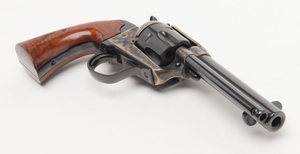Uberti Cattleman Bisley revolver, cal. .357 Magnum, Serial #J76936. The revolver is as new in the box with a 4 3/4” barrel. Finished in blue and case color, the pistol appears to be unfired. The smooth wood grips demonstrate nice fit andfinish. A great gun for the cowboy action shooters. (Modern). Est.: $350-$700.