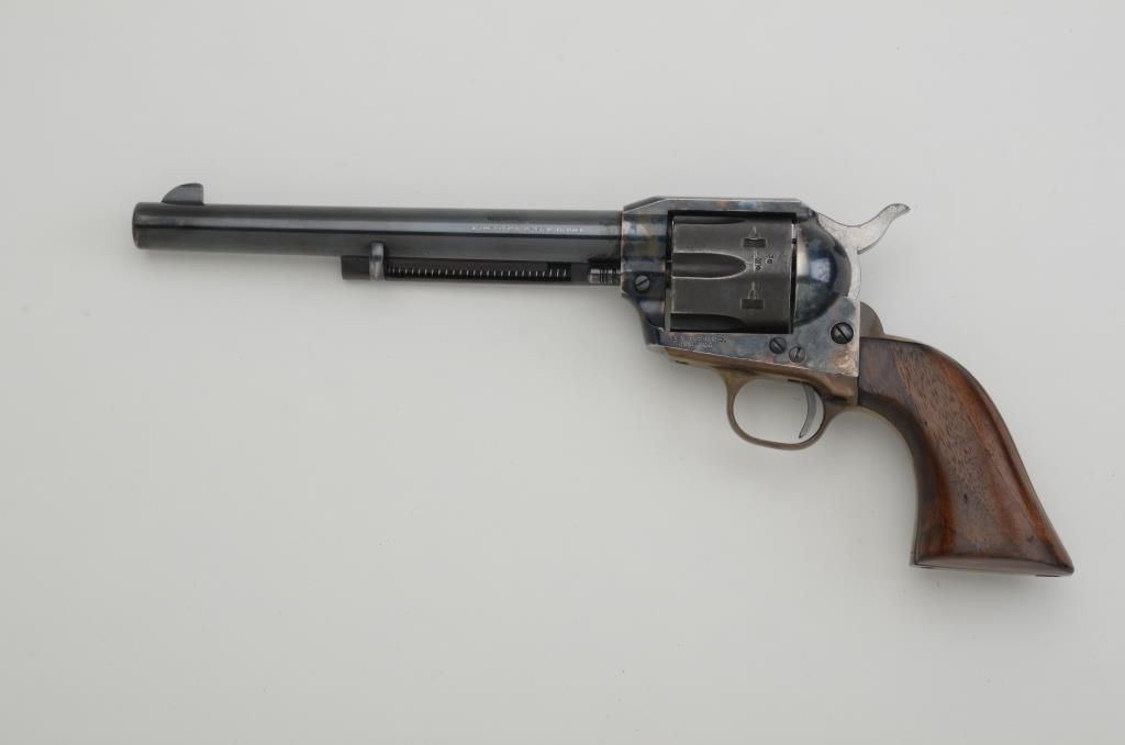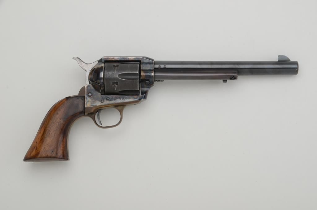 Uberti Cattleman Model SAA revolver, .357 Magnum cal., 7-1/2” barrel, blue and case hardened finish, smooth wood grips, #09322. This gun is in overall fine condition with majority of blue on barrel assembly, darkpatina to cylinder and vivid case colors on frame, bright bore, crisp action and markings, very good grips. Est.: $250-$450.