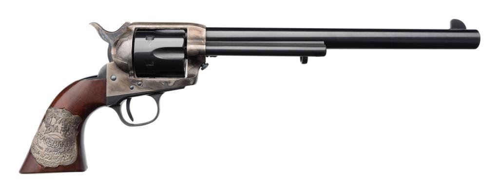 ++Uberti/Cimarron Wyatt Earp Commemorative “Buntline Special” Single Action revolver, .45 Colt caliber, 10” barrel, S/N P13724, blued and case hardened finish, smooth wood grips, plaque inlaid into right grip “WYATT EARP PEACEMAKER, From the Greatful People of Dodge City, APR 1878, 8th”. This gun is in overall like new condition showing little handling. Est.: $600-$1,200.
