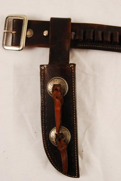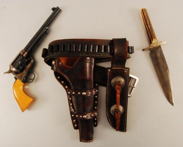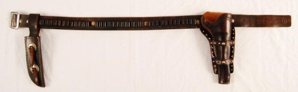 FFL Barrel measures 7 3/8". Knife Measures 12 1/2" long with a 7 5/8" blade. Flynn & Flynn Leon Springs, Tx. Marked Gun belt Rig.