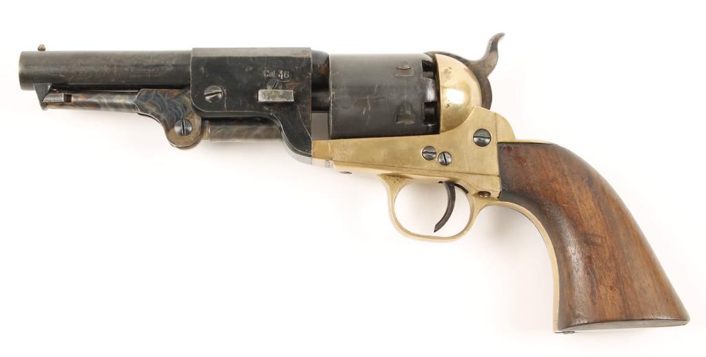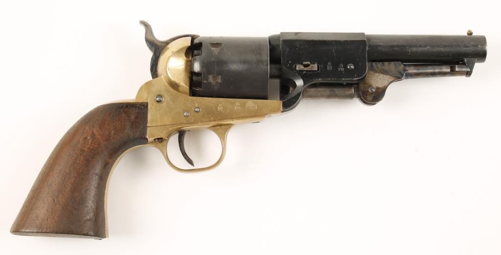 Replica black powder single action 6-shot pistol. 5" blued barrel. Case colored loading lever, hammer and trigger. Blued cylinder. Brass frame, trigger guard and backstrap. Not cut for a shoulder stock. Condition is fair to good. *Antique Firearm*