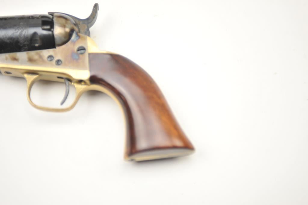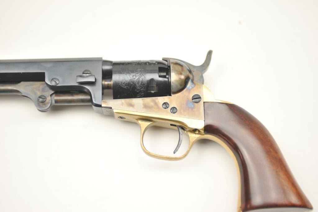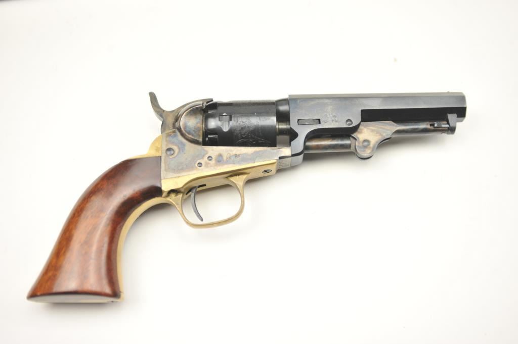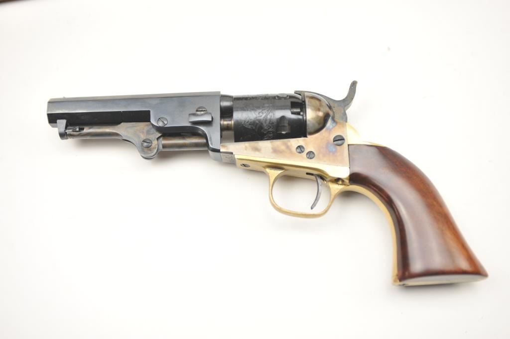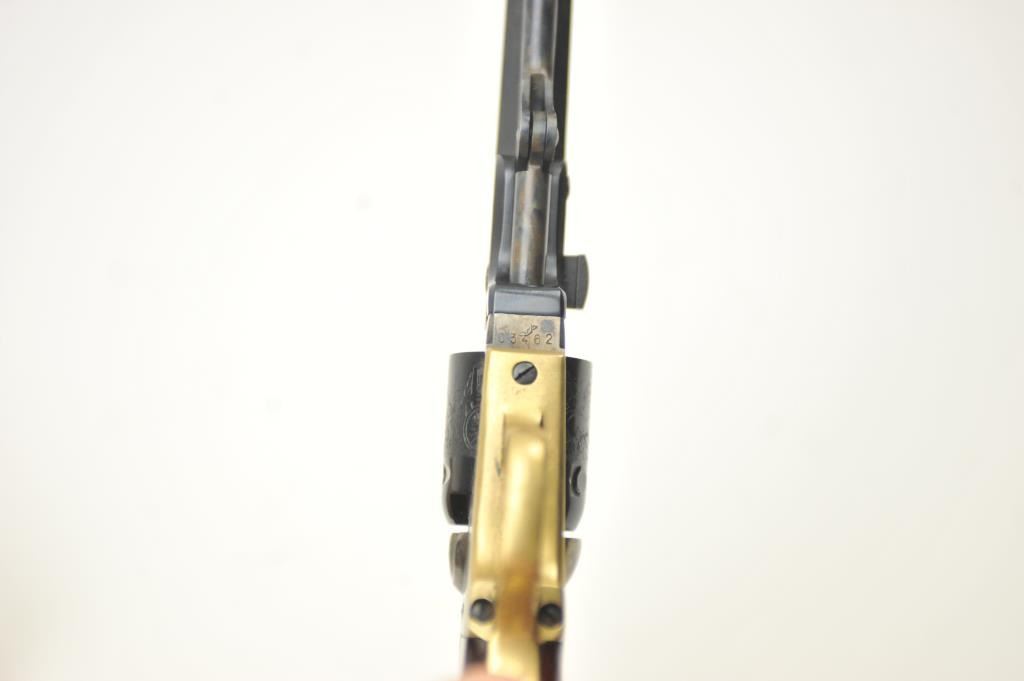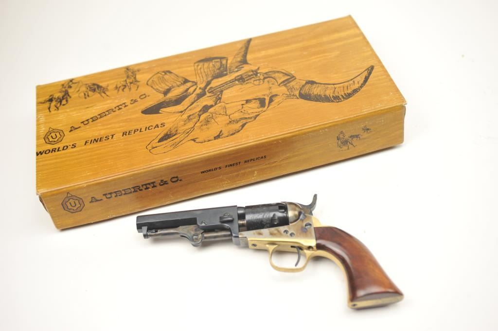 Uberti Italy made replica of Colt 1849 Pocket Model with a 4” barrel, blue and case colored, S/N 03462. Fine to excellent condition in original box. 99%+ and no readily apparent firing or use (That means if you get out a cyclone microscope and find a speck you own the speck too!). (Percussion) Est.: $150-$300