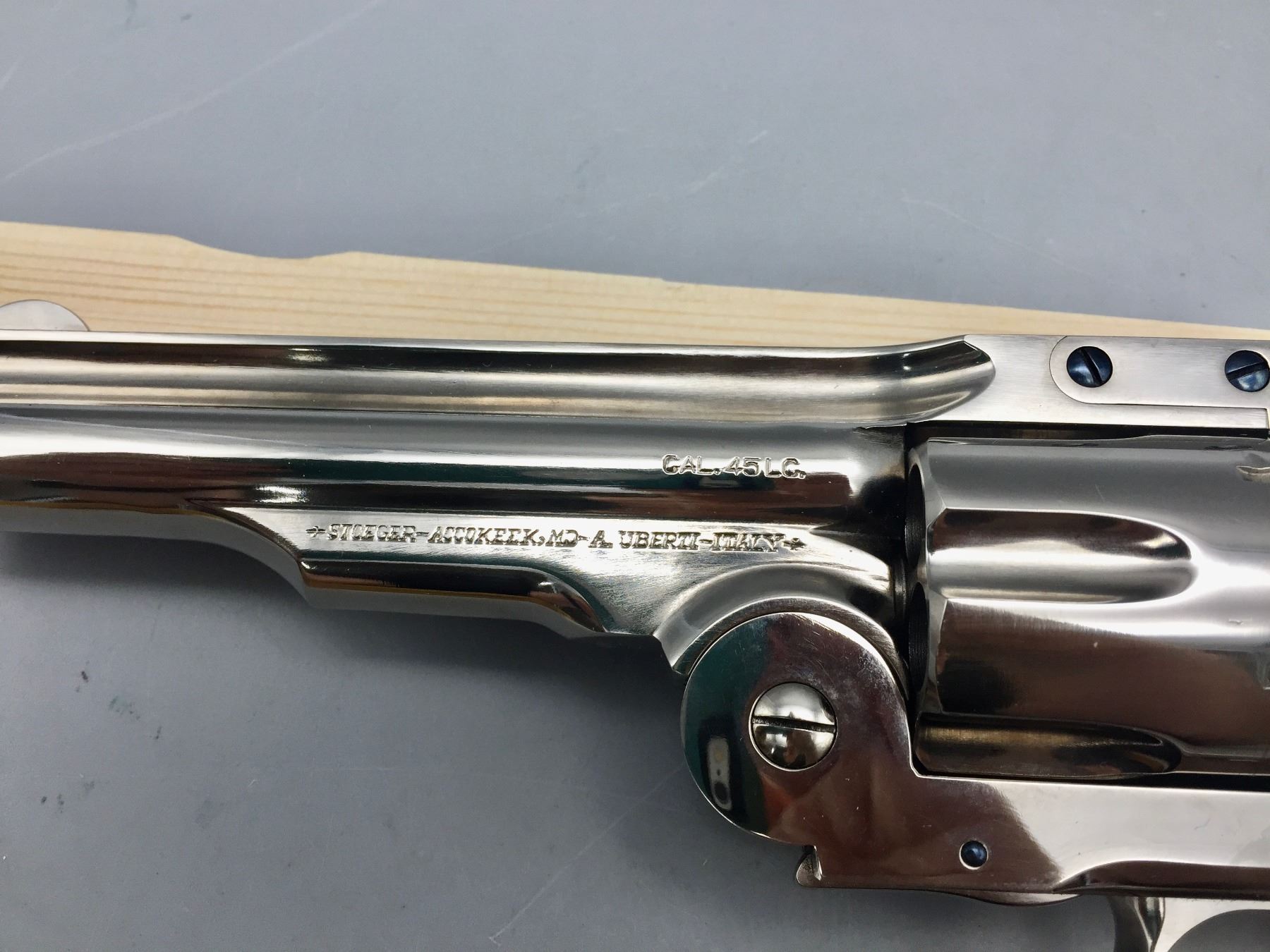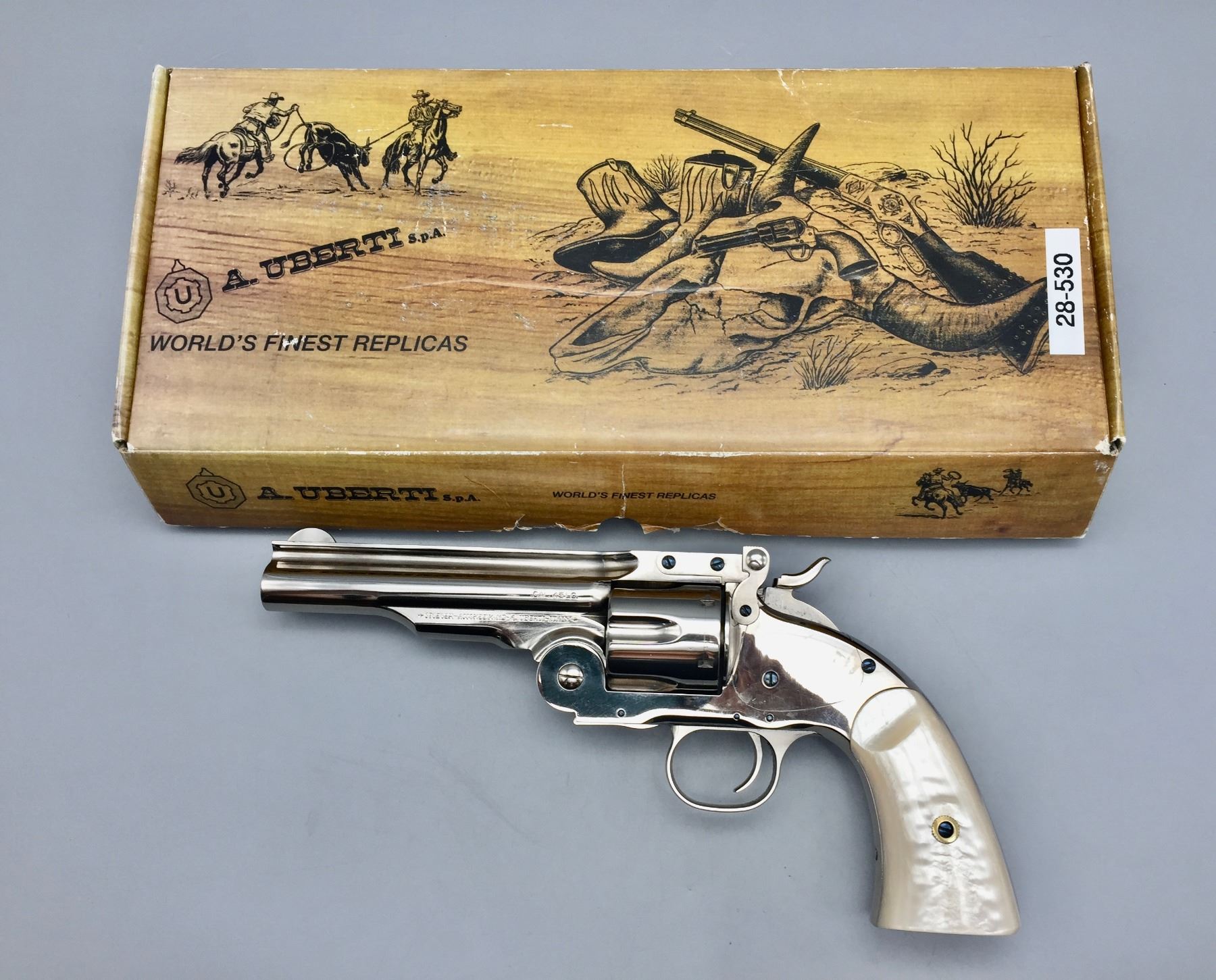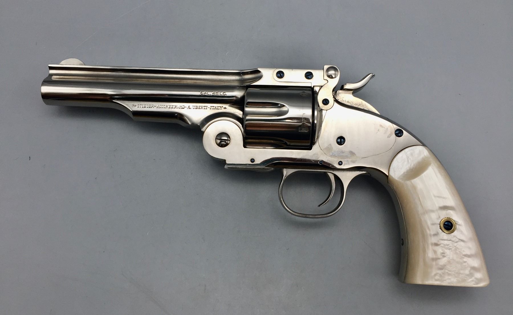 Description: Presented for sale in this lot is a .45 caliber Top Break S.A. Revolver in its original box. This revolver has a stainless steel finish and pearl grips. This is a replica of Model 0855 Schofield #2. Seller bought this as new and never fired it. Maker: A. Uberti S.p.A., Italy. Approx. Age: Modern (serial # F04383). Size: Barrel measures 5”. Condition: Good. Please look closely at the pictures - they are an important part of our description. Shipping: There will be a $10 handling / packaging fee for shipping this lot. The actual cost of postage will be added on top of that. *****This firearm requires an FFL Transfer*****