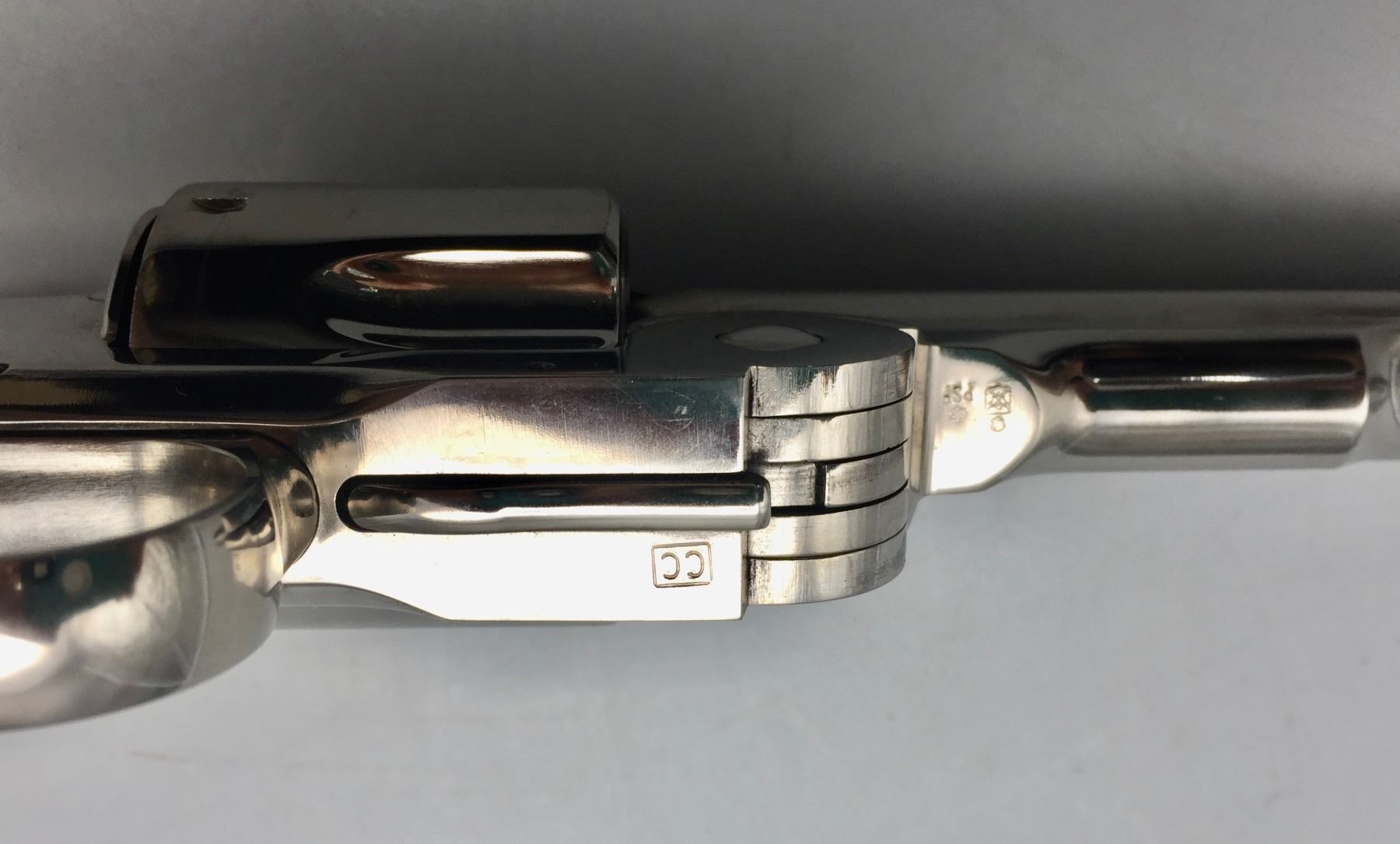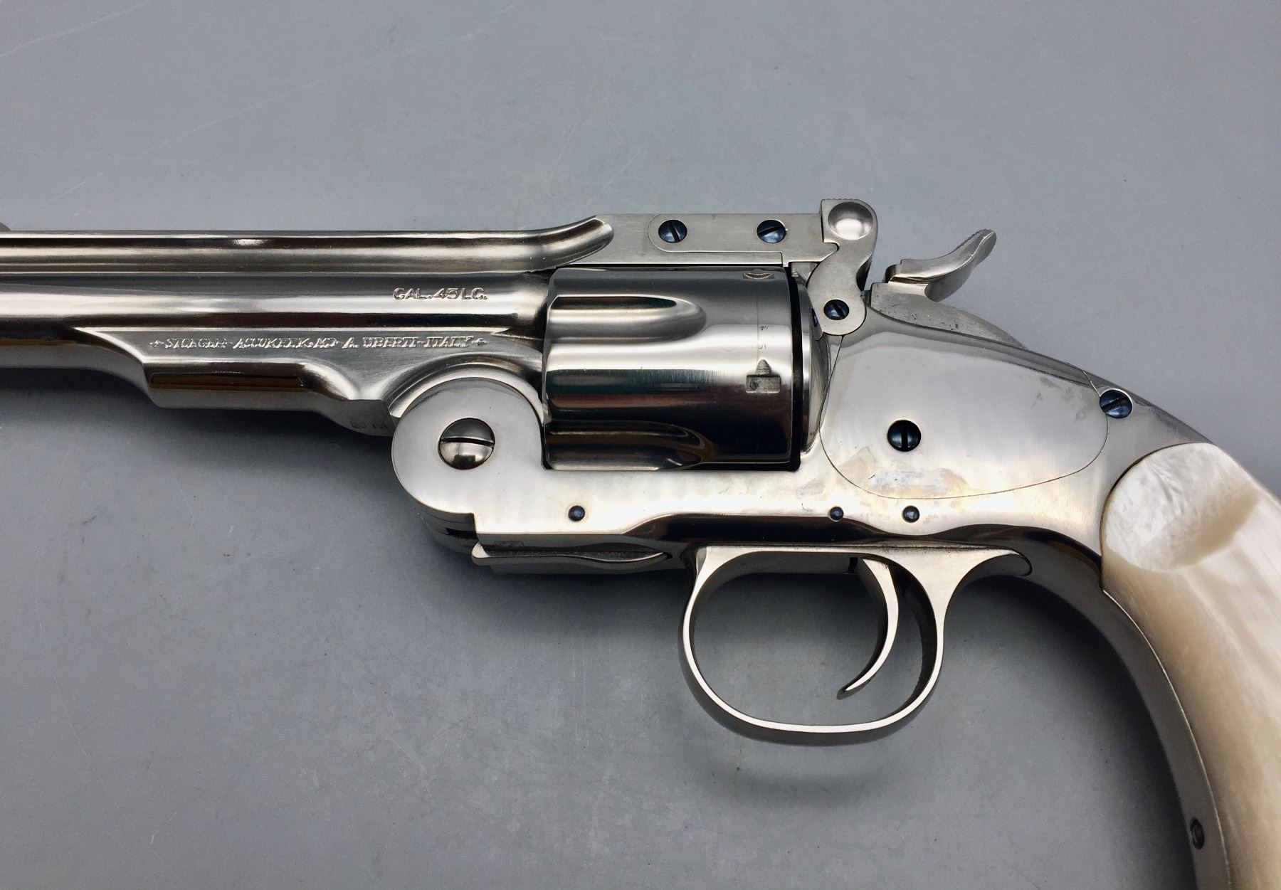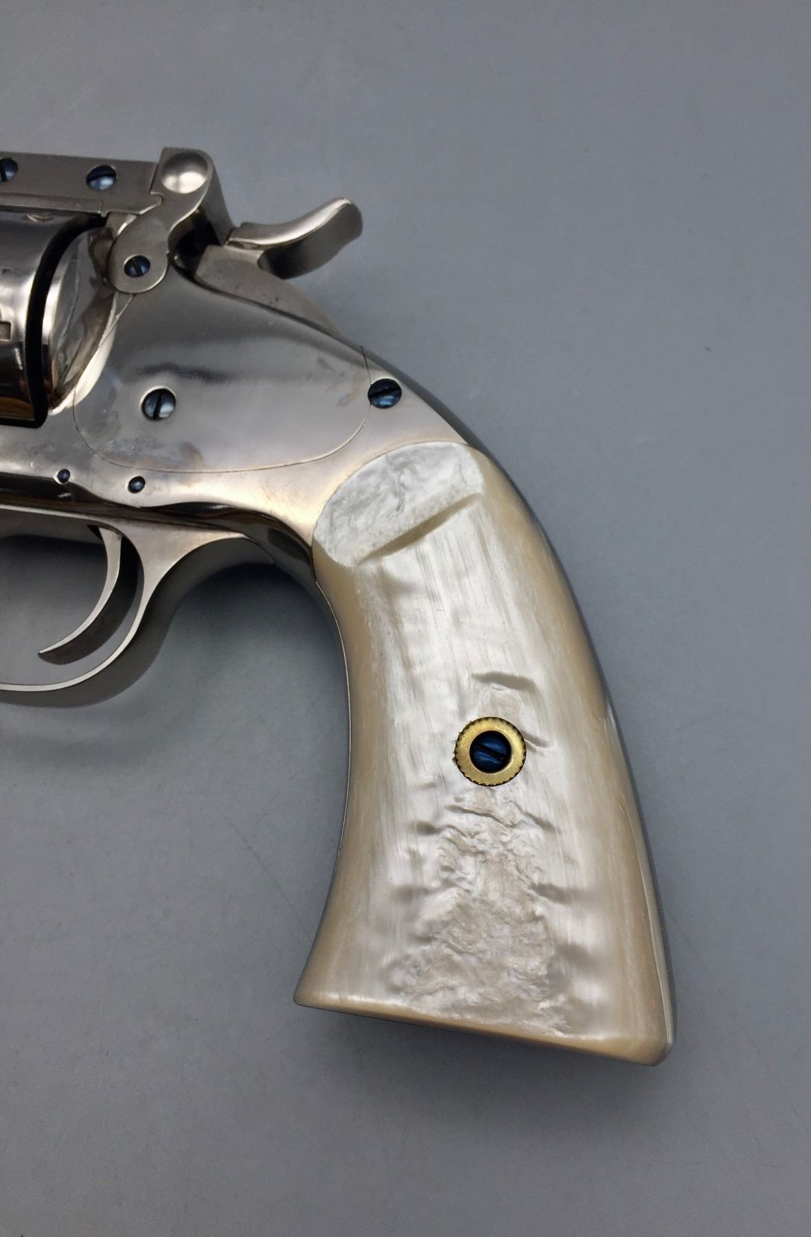 Description: Presented for sale in this lot is a .45 caliber Top Break S.A. Revolver in its original box. This revolver has a stainless steel finish and pearl grips. This is a replica of Model 0855 Schofield #2. Seller bought this as new and never fired it. Maker: A. Uberti S.p.A., Italy. Approx. Age: Modern (serial # F04383). Size: Barrel measures 5”. Condition: Good. Please look closely at the pictures - they are an important part of our description. Shipping: There will be a $10 handling / packaging fee for shipping this lot. The actual cost of postage will be added on top of that. *****This firearm requires an FFL Transfer*****