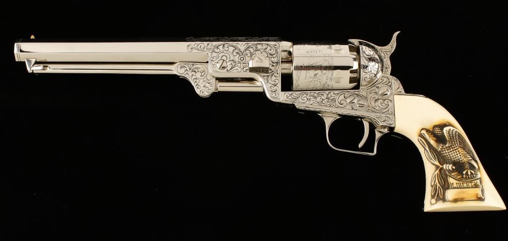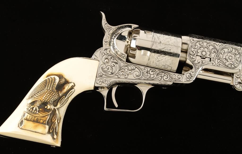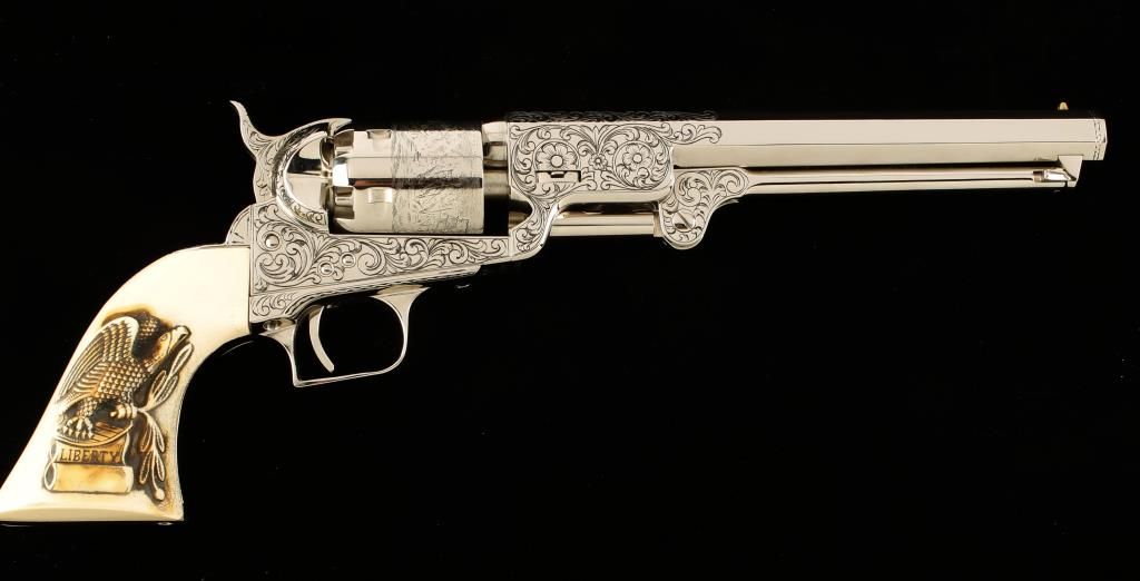 Italian Made single action open top reproduction percussion revolver with 7-1/2" octagon barrel. Nickel finish, scroll engraved frame, 1/3 of barrel and loading lever flats, faux ivory grips with raised eagle with olive leave in one claw and scroll in the the other with the word "Liberty". Cylinder shows Naval battle scene. Bottom of butt enf\graved "JBH136". Excellent bore and action. Condition: Excellent