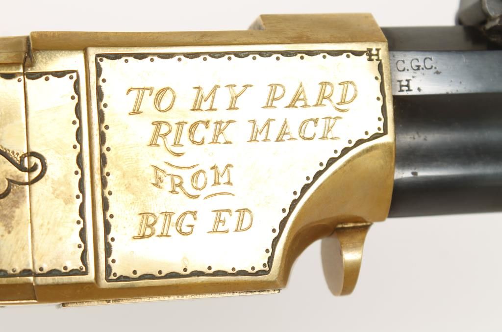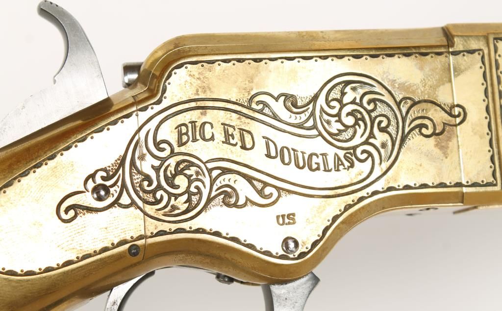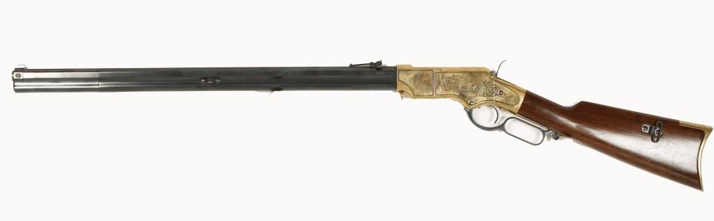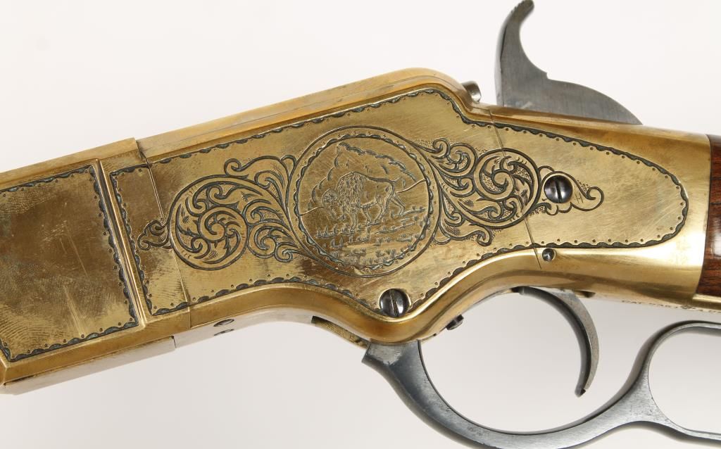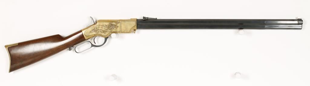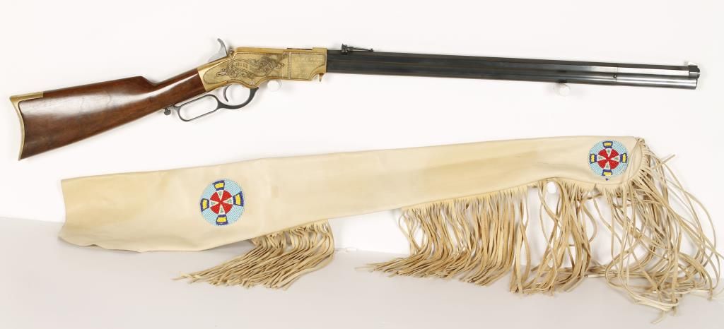 Italian made lever action copy of the Henry rifle with 24" octagon barrel. Brass frame and crescent butt plate, blued barrel and full length tube magazine, straight grip wood stock and sling swivels. Left side of receiver engraved with an image of a buffalo and right side scroll engraved with banner that reads "Big Ed Douglas" and inscribed "To My Pard Rick Mack From Big Ed". Good bore and action. Includes tanned leather scabbard with bead work. Condition: Good overall showing brass needing cleaned up. *Modern Firearm*