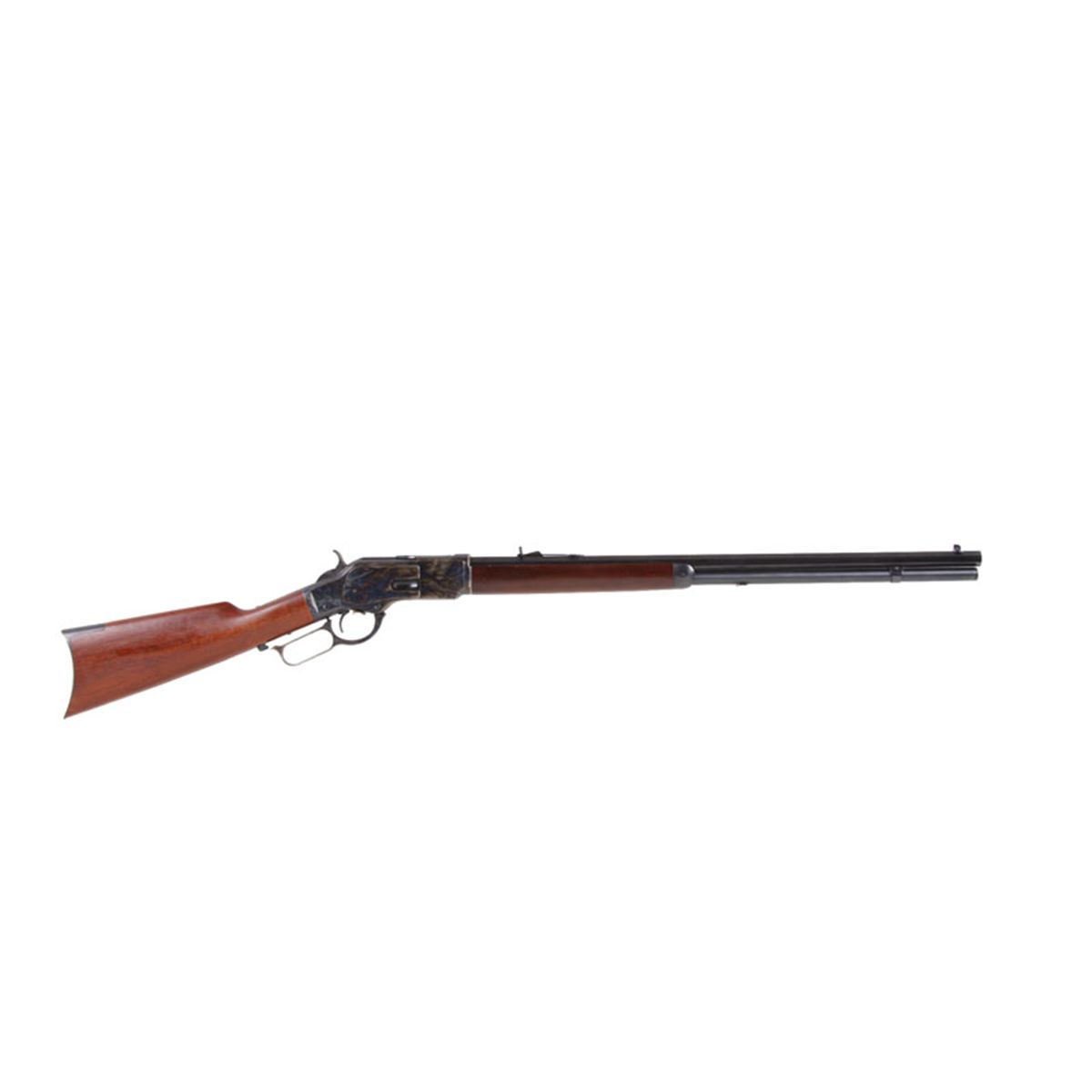 Uberti Mdl 1873 Cal .45LC SN:69582 Modern replica of Winchester 1873 made in Italy. Blued barrel & magazine, case color receiver and lever, smooth wood straight grips stock and forearm with curved steel butt plate, 24" octagonal barrel with buckhorn rifModern replica of Winchester 1873 made in Italy. Blued barrel & magazine, case color receiver and lever, smooth wood straight grips stock and forearm with curved steel butt plate, 24" octagonal barrel withbuckhorn rifle sights, good bore and action. Condition: Near new with little sign of use.