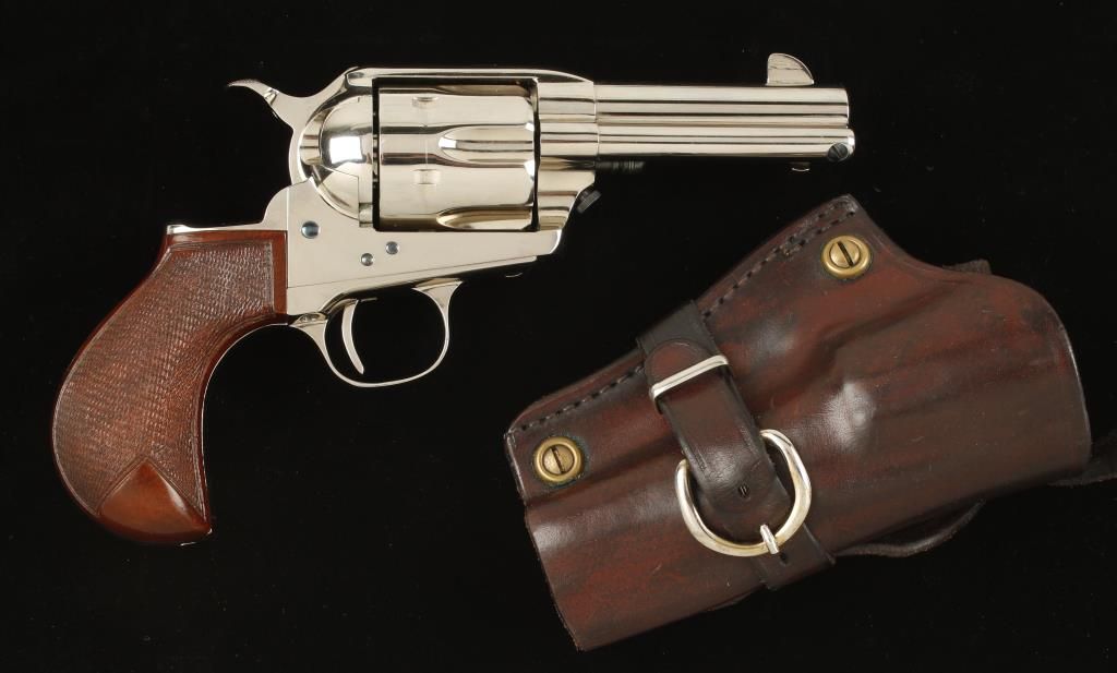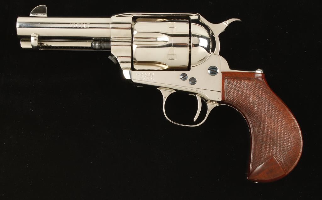 Italian made single action version of a Colt 1877 "Thunderer" with 3-1/2" barrel, nickel finish, checkered wood birds head grips, and fixed sights and ejector rod. Very good bore and action. Includes unmarked quality made leather holster, extra hammer and .45ACP cylinder. Condition: Very Good showing very light holster wear and slight cylinder ring. *MODERN FIREARMS*