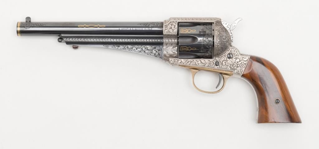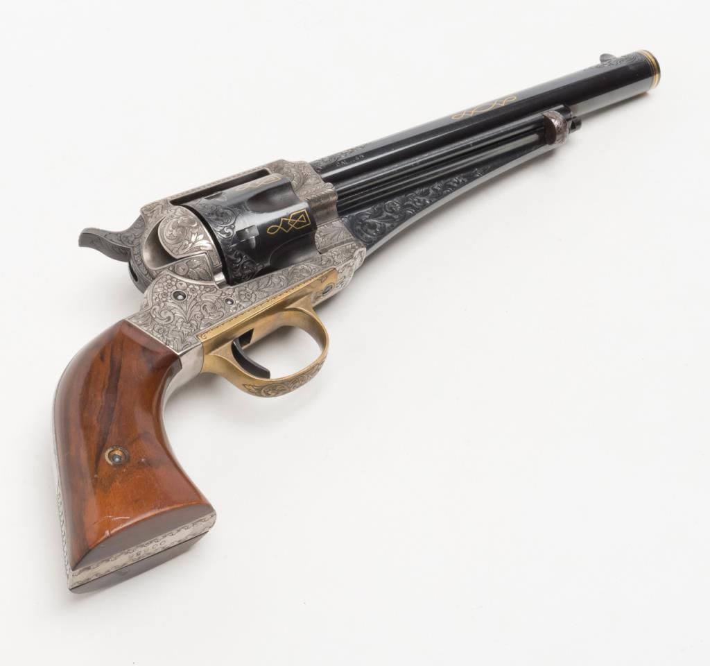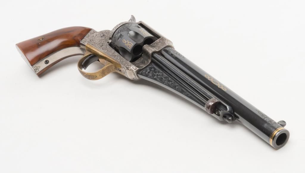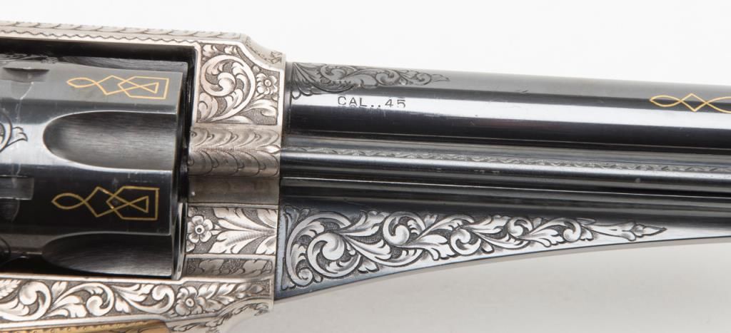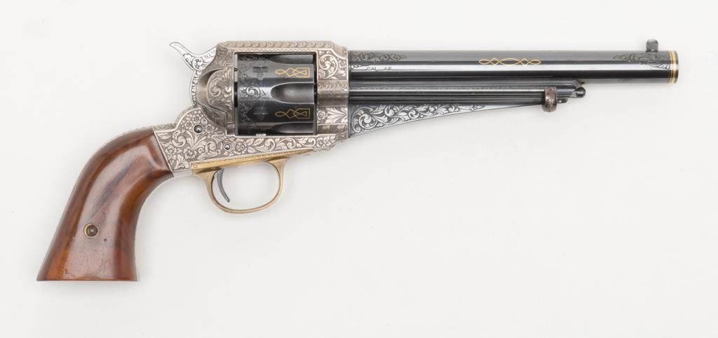 Uberti Model 1875 Single Action Remington style revolver, cal. .45 Colt, Serial #00656. The pistol is in overall excellent condition with a 7 ½” barrel. The pistol is beautifully engraved and finished in gold with blue and satin finish. The pistol was made as a factory display piece and featured great detail and finish. The smooth wood grips show fantastic figure and graining. An exceptional Uberti. (Modern). Est.: $700-$1,400.
