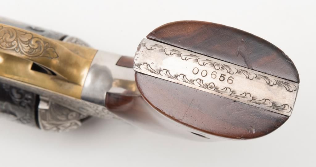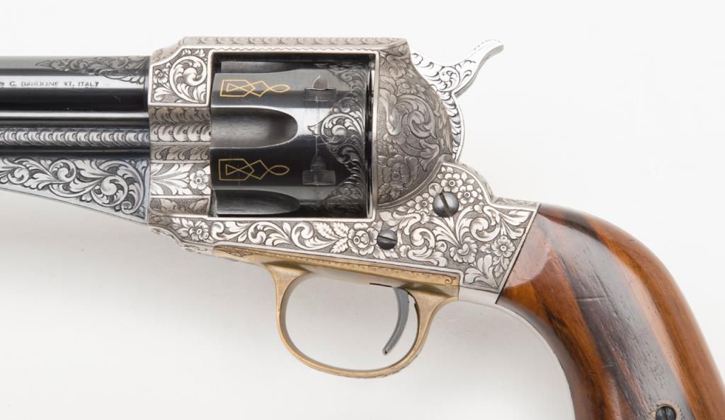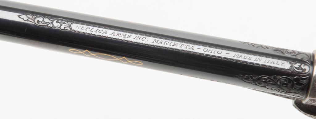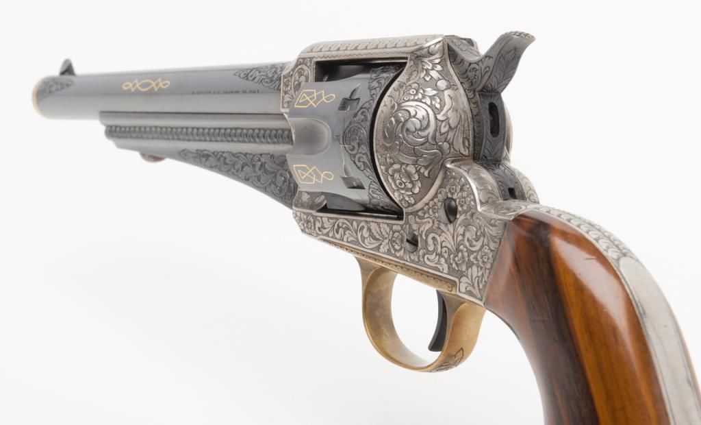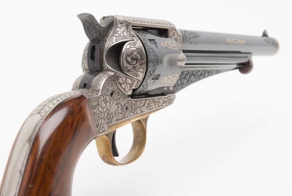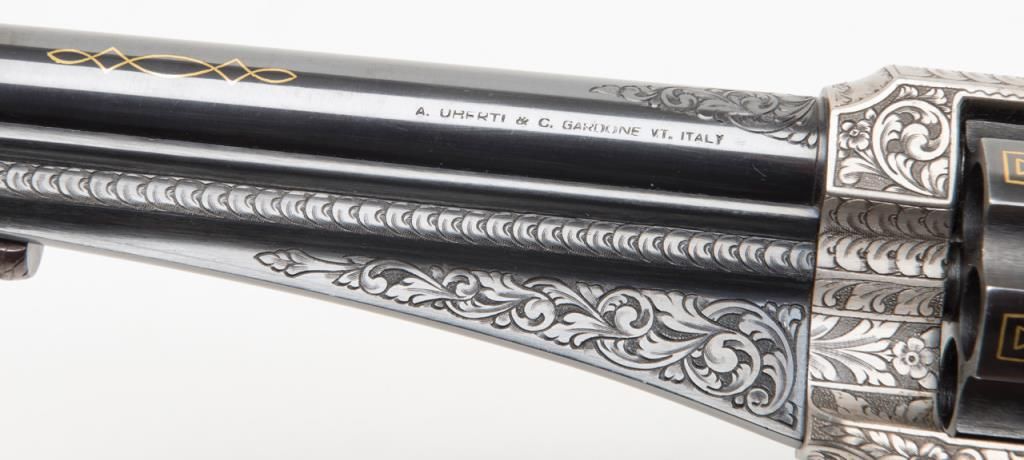 Uberti Model 1875 Single Action Remington style revolver, cal. .45 Colt, Serial #00656. The pistol is in overall excellent condition with a 7 ½” barrel. The pistol is beautifully engraved and finished in gold with blue and satin finish. The pistol was made as a factory display piece and featured great detail and finish. The smooth wood grips show fantastic figure and graining. An exceptional Uberti. (Modern). Est.: $700-$1,400.