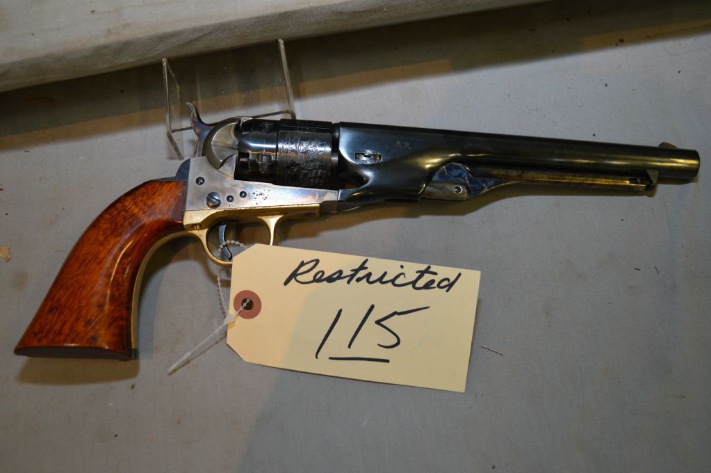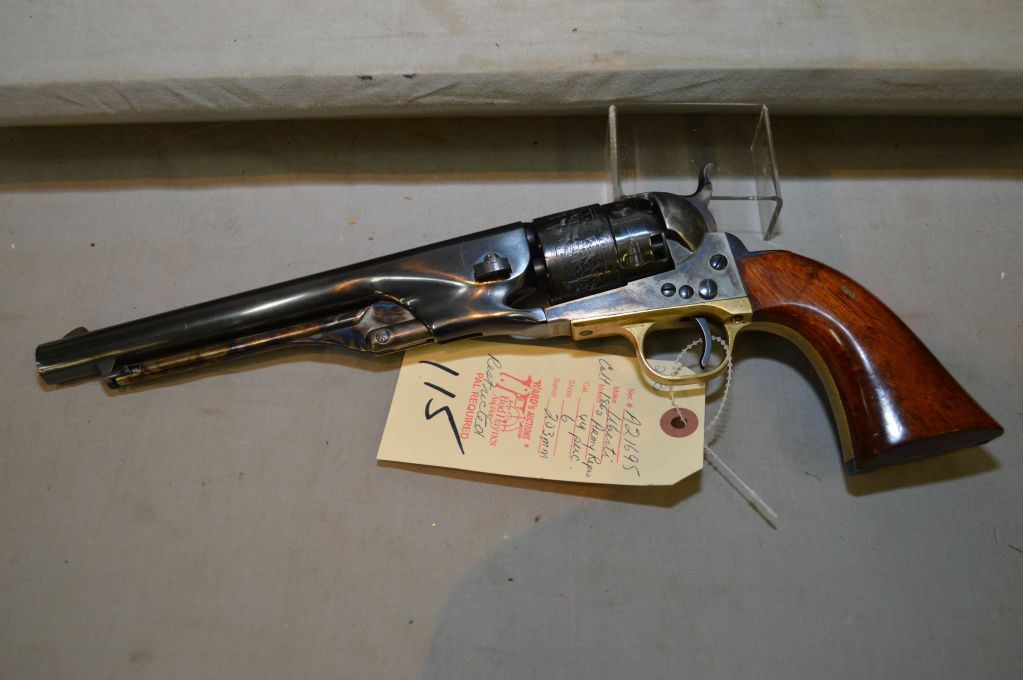 Uberti Model Colt 1860 Army Reproduction .44 Perc Cal 6 Shot Revolver w/ 203 mm bbl [ blued finish, with few scratches, cylinder has faint ring, also engraved scene, case colored receiver,loading lever & hammer, brass trigger guard & front strap, wooden grips w/few scratches ] Ser # A21695 Restricted Handgun Cert # 18267322