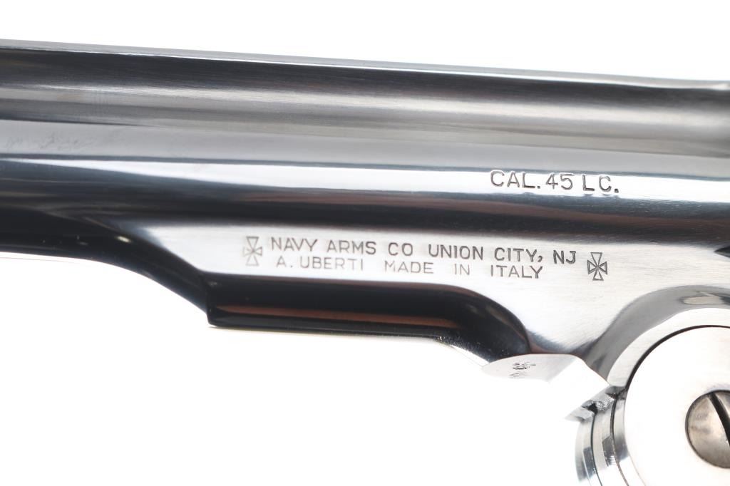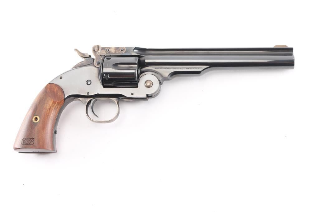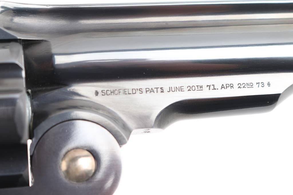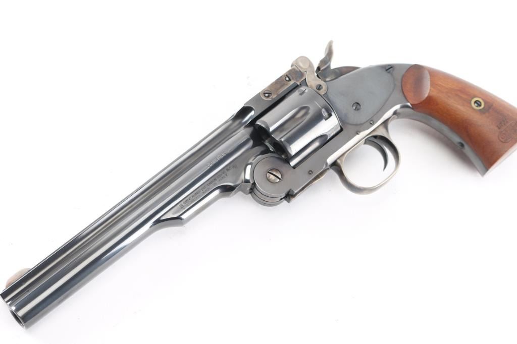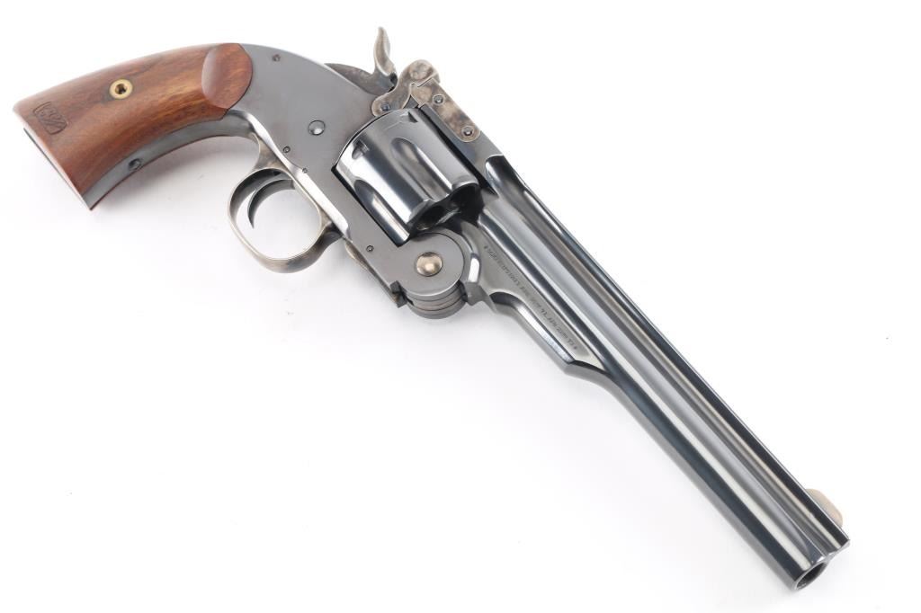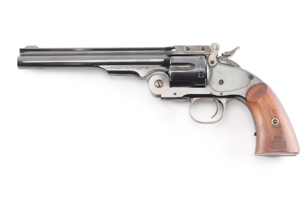 High quality reproduction of the Smith & Wesson No. 3 Schofield 2nd Model top-break single action revolver, chambered in 45 Colt. Manufactured in Italy and imported by Navy Arms with import stamp on the left side of the barrel. Features a bright blue finish with case colored accents on trigger & guard, hammer, latch, solid ribbed 7" barrel, round blade front sight, ‘v’ notch rear sight cut in the barrel latch, smooth trigger, knurled hammer spur, fluted six-shot cylinder with automatic ejector, ejector override latch under hinge, frame with “U.S.” marked on the butt, and two-piece smooth walnut grips with 1877 dated replica US inspector markings. Bore and charge holes are pristine. Retains 95% finish with handling marks. Grips are excellent. Action is smooth with tight lock-up. Cylinder spins freely with hammer at half-cock.Condition is NRA Excellent. Modern Firearm.