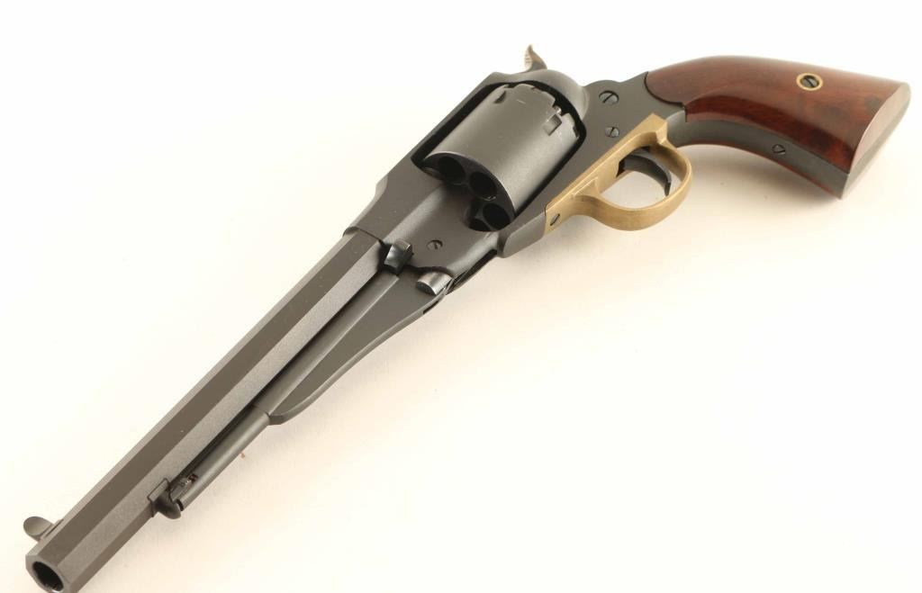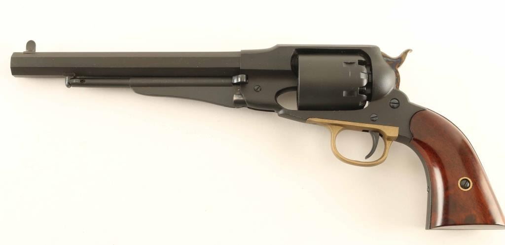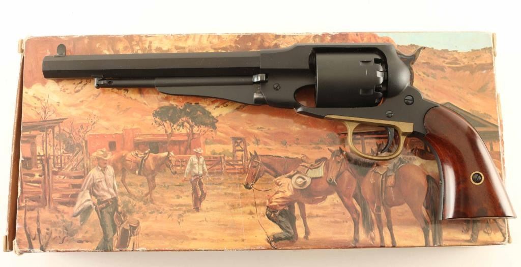 Italian made reproduction of the Remington New Model Army single action percussion revolver chambered for .44 caliber ammunition, manufactured circa 2001. Features a matte black finish, 8" octagonal barrel, pinched post front sight, 'v' notched rear sight, loading lever, non-fluted six shot cylinder, smooth wide trigger, brass trigger guard, case hardened hammer with knurled spur, and two-piece smooth walnut grips. Includes a Pietta box. Revolver exhibits approximately 99% of it's original matte black finish very little wear. Action is smooth, the bore is pristine and the wood grips are fine. Condition is near NRA Perfect. ***Antique Firearm***