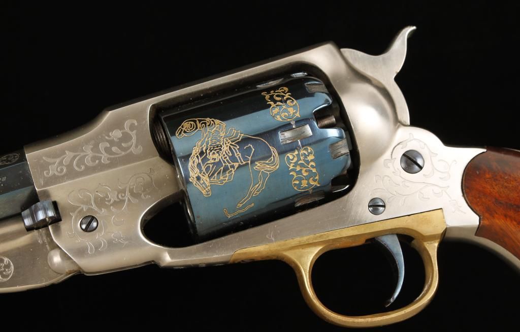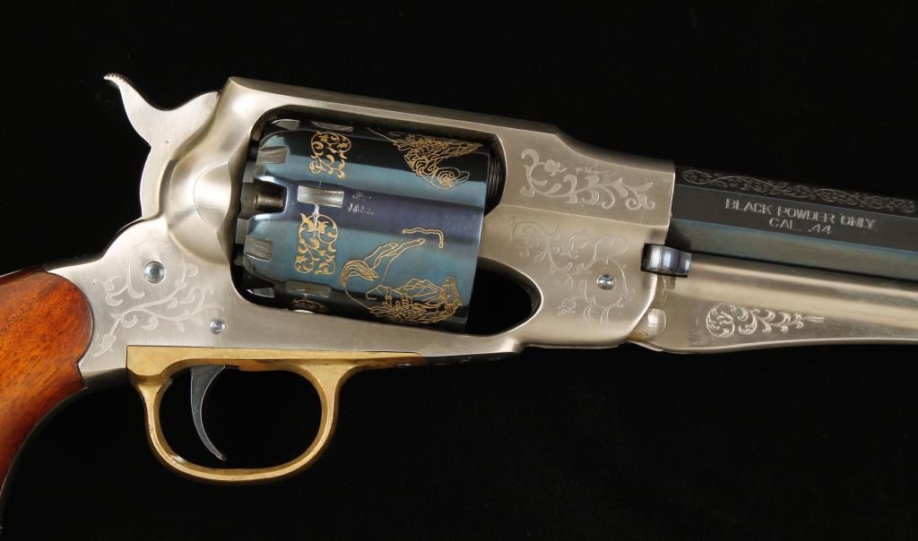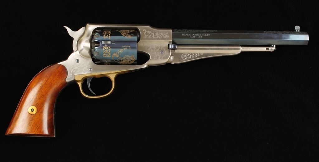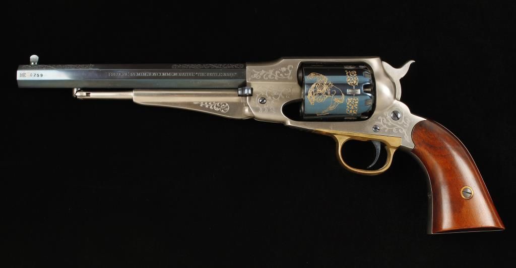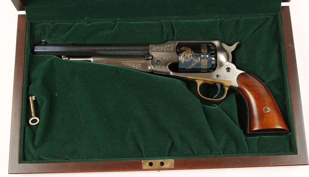 New England Collectors Association cased commemorative of Frederic Remington's "The Rattlesnake". Number 259 of 5000. Replica black powder single action 6-shot pistol. Nitre blued barrel, trigger and cylinder. Scroll engraving on barrel and 24 Karat gold highlighted engraving of The Rattlesnake and scrolls on the cylinder. Stainless (or in the white) loading lever, frame (with scrollwork engraving) and hammer. Brass trigger guard. Not cut for a shoulder stock. Case appears to be American Cherry and has a velvet lining. Included inside are the case key, certificate, manual, documents and a handbill for a Frederic Remington showing at the Denver Art Museum. Condition is Like New in Box. *Antique Firearm*