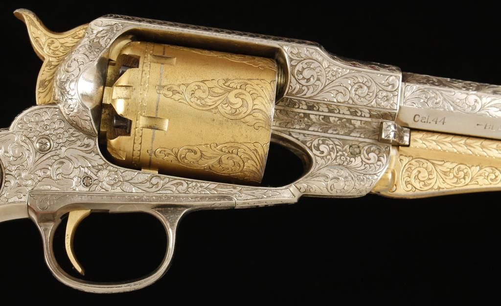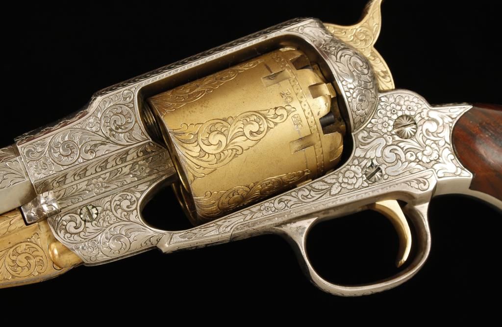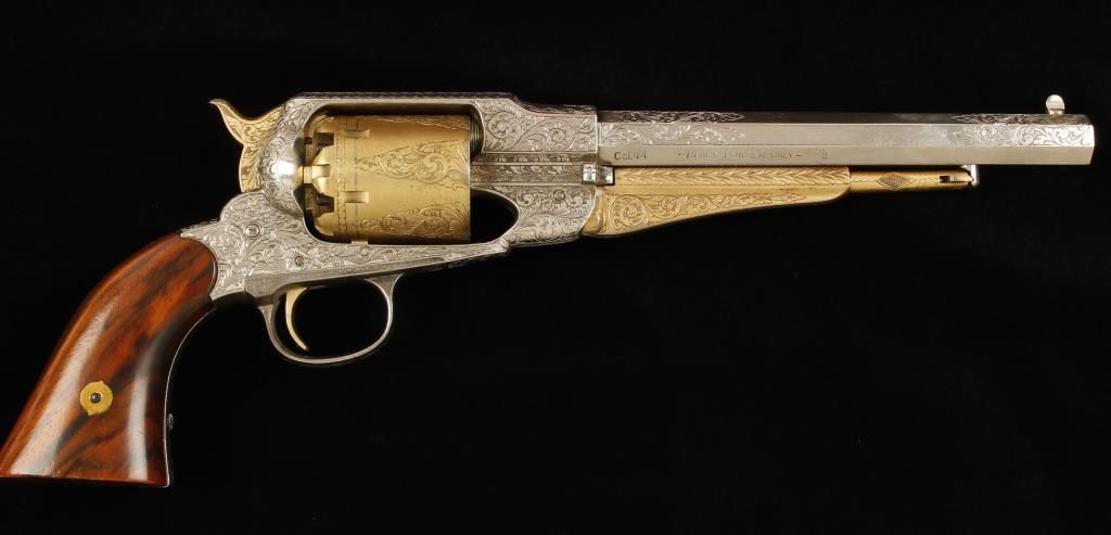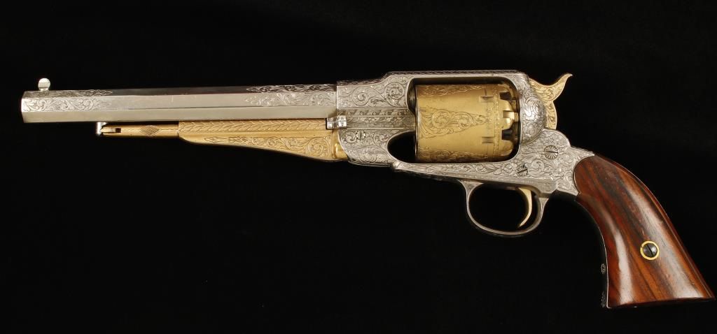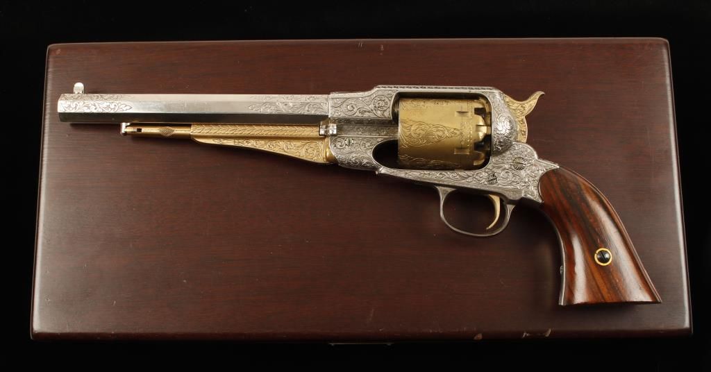Cased plated and engraved replica black powder single action 6-shot percussion pistol. Stainless 8" octagon barrel. Gold colored loading lever, hammer, trigger and cylinder. Stainless frame and trigger guard. Not cut for a shoulder stock. Lined hardwood case with loading and maintenance tools. Condition is very good. *Antique Firearm*