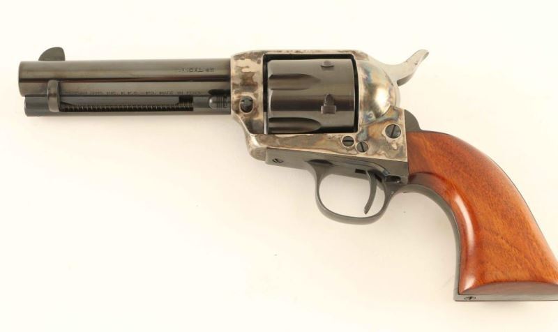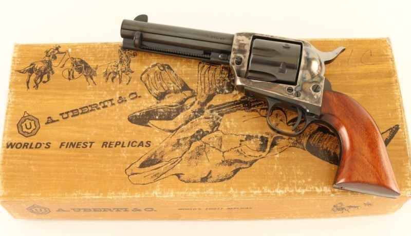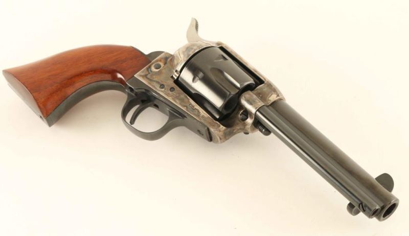 Italian made single-action six-shot revolver chambered in .45 Colt, manufactured circa 1996. Imported by American Arms Inc. of North Kansas City, M.O. with import stamp on the underside of the barrel. Features a blued & case hardened finish, 4 3/4" barrel, blade front sight, 'v' notched rear sight, ejector rod, fluted cylinder, smooth trigger, knurled hammer spur, and one-piece vanished smooth walnut grip. Includes the original factory cardboard box. Revolver exhibits approximately 96% of it's original finish showing drag wear on the cylinder and a small amount of light surface rust on the butt. Action is crisp with good lock-up, the bore is excellent and the wood grip is near fine. Condition is NRA Good+++. ***Modern Firearm***