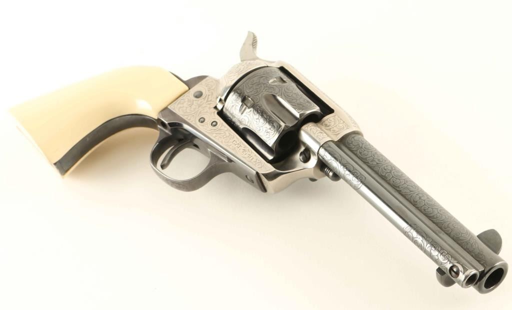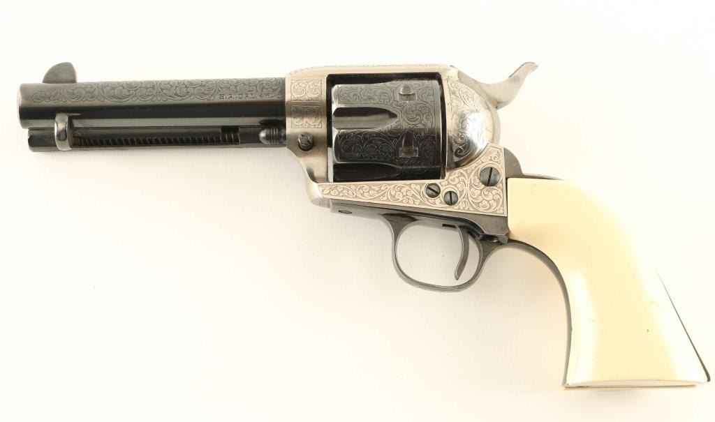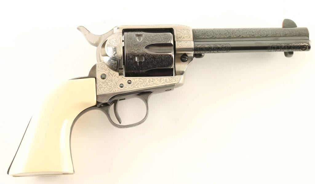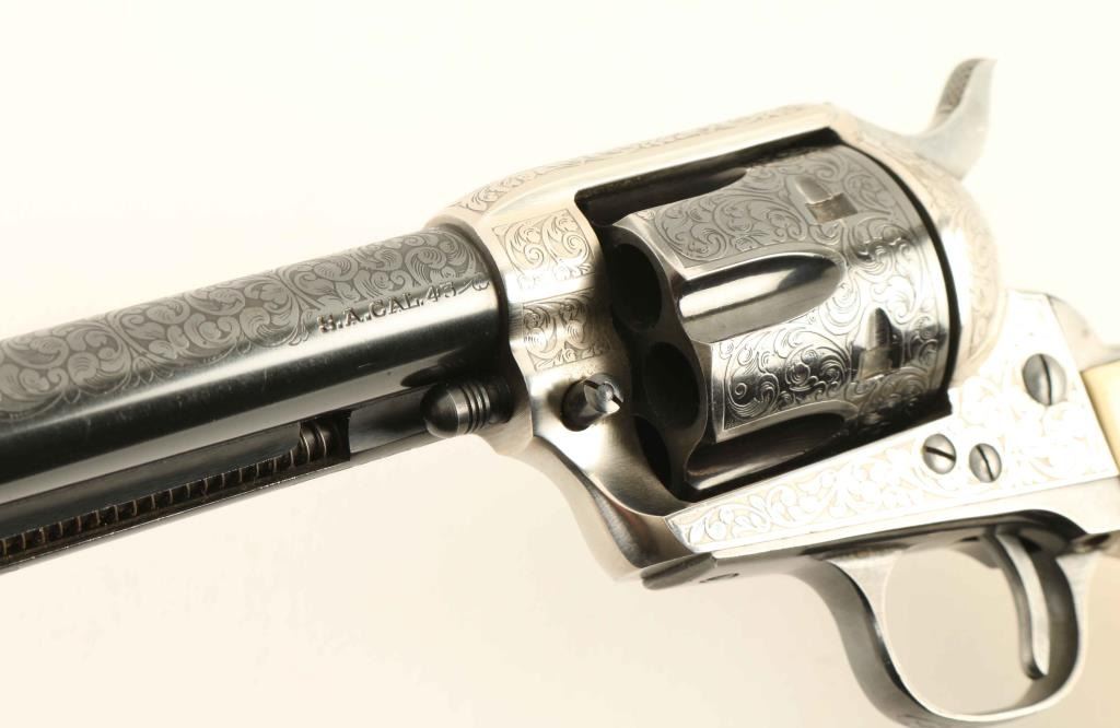 Engraved reproduction of the Colt Single Action Army revolver, chambered in .45 Colt and manufactured in Italy circa 2005. Imported by American Arms Inc. of North Kansas City, Missouri with the import information stamped on the underside of the barrel. Features a blued & nickel plated finish, 75% coverage laser cut scroll engraving, 4 3/4" barrel, blade front sight with orange painted accent, 'v' notched rear sight, smooth thin trigger, knurled hammer spur, fluted six-shot cylinder, ejector rod, and one-piece faux ivory synthetic grips. Revolver exhibits approximately 96% of it's original finish showing light holster wear, some minor wear on the flutes above the stops in the cylinder, and a small spot of pin prick pitting on the backstrap. Action is smooth with very good lock-up, the bore is very good and the synthetic grips are good with scrapes a crack in the toe on the left side. Condition is near NRA Very Good. ***Modern Firearm***