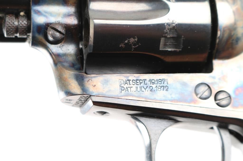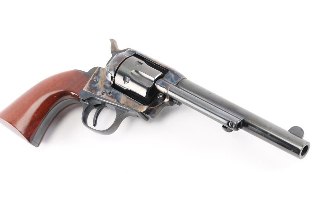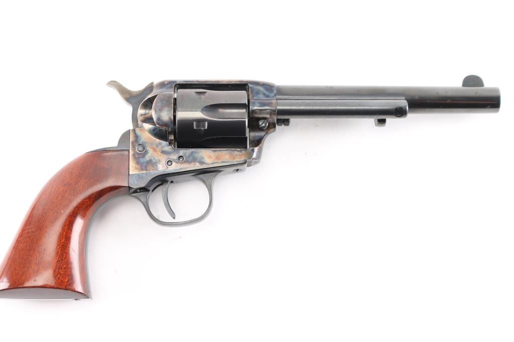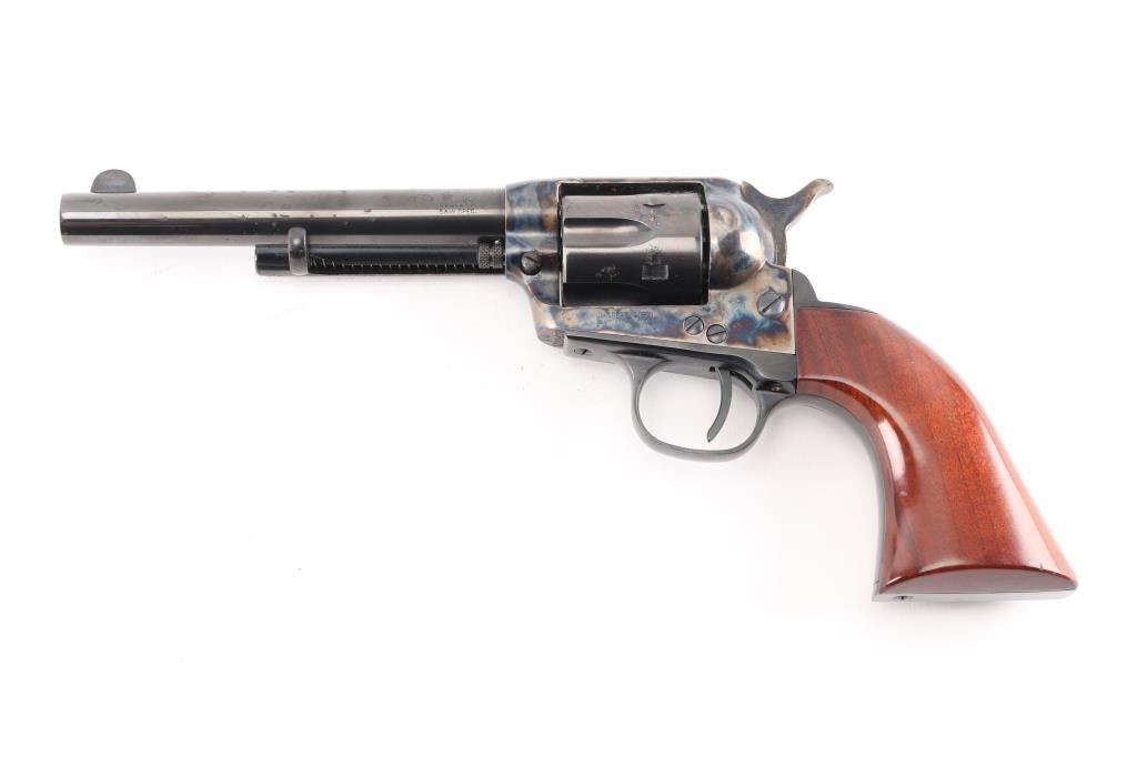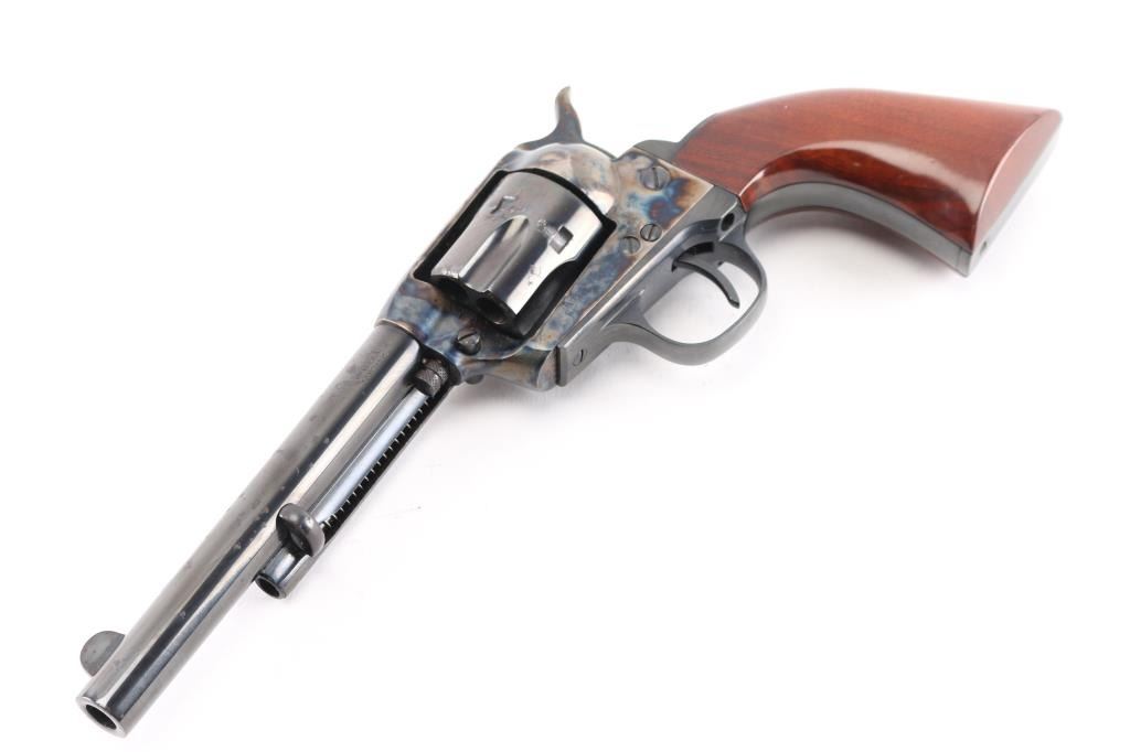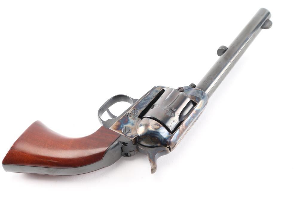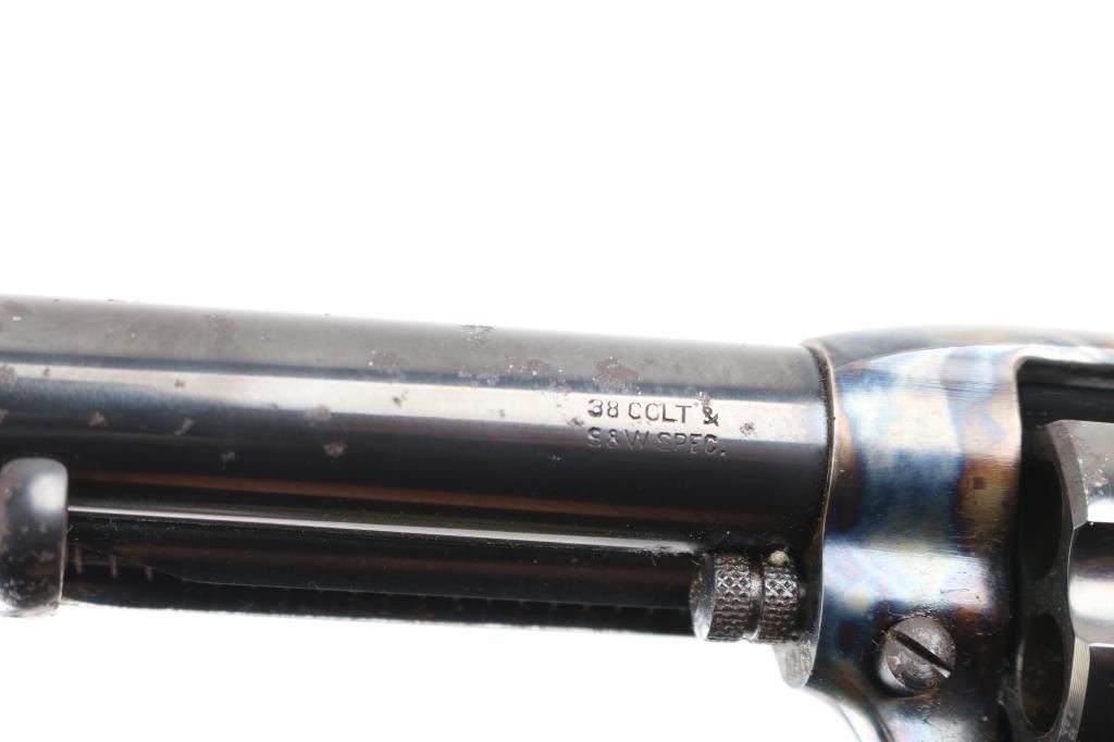 Italian made six shot revolver chambered in .38 S&W and modeled after the Colt Single Action Army. Features a 5.5" 6 groove, right twist barrel, fixed sights, blue finish with case hardened frame& hammer, checkered hammer spur one piece high gloss finished grips. . Bore and charge holes are excellent, dusty, metal finish and grips are excellent, action is crisp, case coloreed is very good, the blued barrel & cylinder have scatterd patches of light pitting.