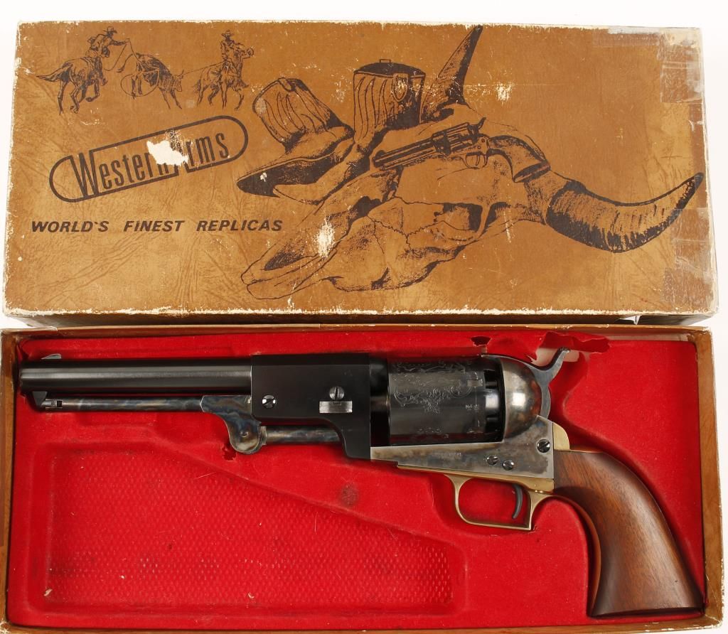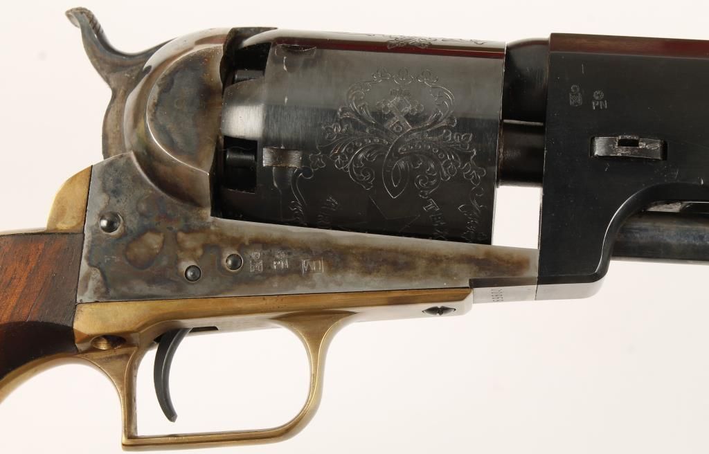 Replica black powder single action 6-shot percussion pistol. Blue 7-1/2" barrel. Case colored loading lever, frame, hammer and trigger. Blued and roll-stamped cylinder showing "Texas Arms" and medieval soldiers. Brass square backed trigger guard and backstrap. Not cut for a shoulder stock. Comes in factory box. Condition is good. *Antique Firearm*
